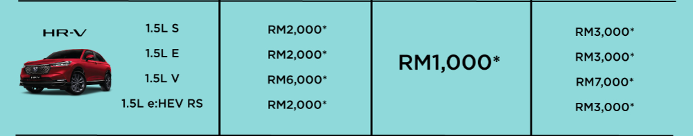 Honda HR-V 原本只为三款燃油车型提供优惠,本月优惠新增了混合动力车型 1.5L e:HEV RS ,现金优惠为 RM2,000,同时 1.5L V 也将现金优惠额提高至 RM6,000。总优惠介于 RM3,000 至 RM7,000。