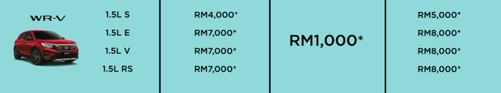 WR-V 则调高了现金优惠,降低了最终优惠,但优惠总额维持不变。现金优惠介于 RM4,000 至 RM7,000,最终奖励为 RM1,000,总优惠为RM5,000 至 RM8,000。
