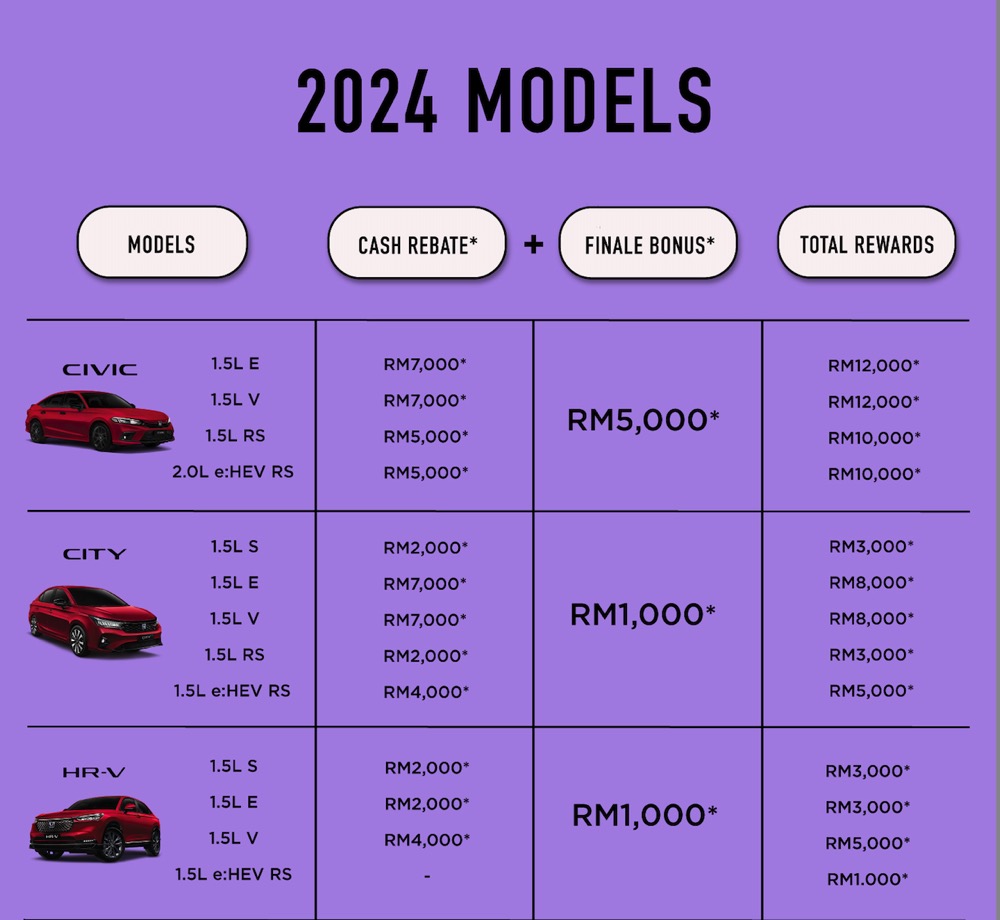 Honda 旗下的其他车款同样推出优惠配套,每款车型都可想有最低 RM1,000 折扣优惠。Honda Civic 的现金优惠介于 RM5,000 至 RM7,000,加上 RM5,000 的最终奖励,总优惠高达 RM10,000 至 RM12,000。