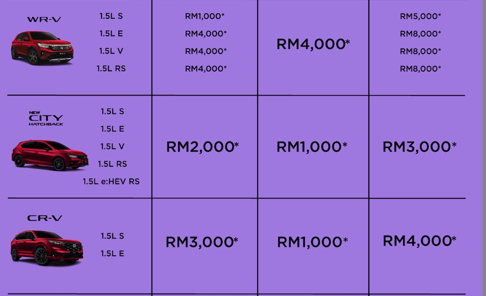 Honda HR-V 的现金优惠则从 RM2,000 至 RM4,000 不等,加上 RM1,000 最终奖励,总优惠介于 RM1,000 至 RM5,000。