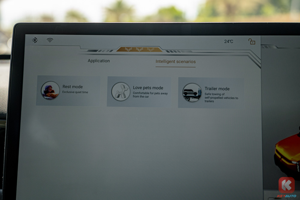 03 的内装设计相当简约,中控台上一个 15.6 寸 大屏幕,驾驶座前一个 9.2 长条显示屏,仅此而已,所有同于调整的功能都集成进中控屏幕里,采用系统操作,如调整冷气,后视镜角度,座椅通风等等。