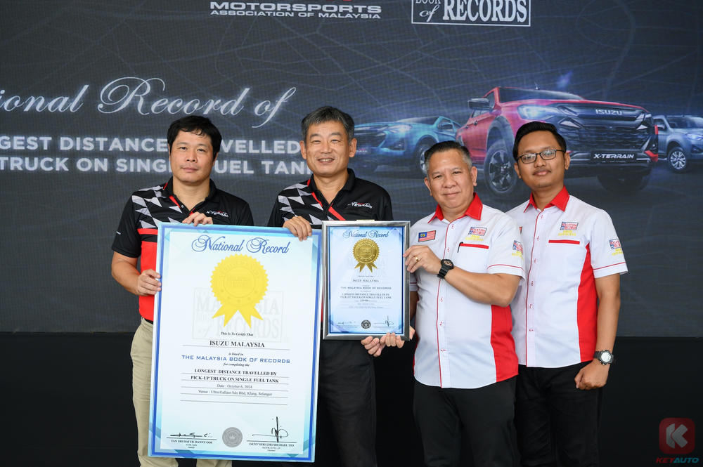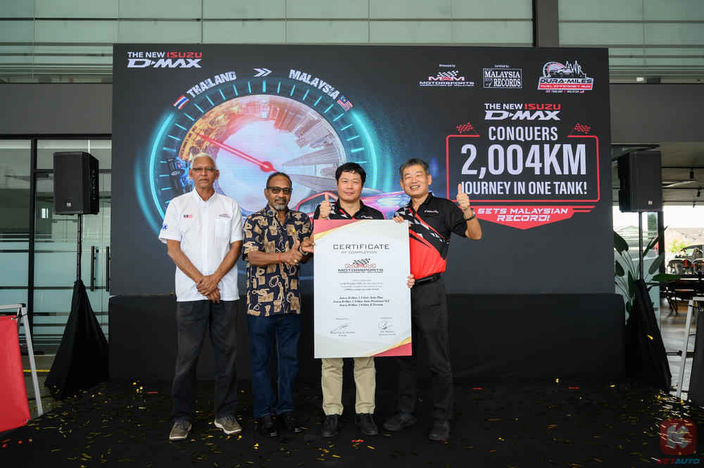 在仪式上,冈添俊介与轻型商用车部门首席运营官十川憲吉一起接收了 MAM 秘书长 S.N. Nanthan 和技术监督员 Muhd. Siraj 手中的证书,并从马来西亚纪录大全官员 Edwin Yeo 和 Mohd. Nazrul 手中接过成就证书。。十川憲吉激动地表示,这一成就代表着每位 Isuzu D-Max 车主的胜利。敬请锁定 KeyAuto.my