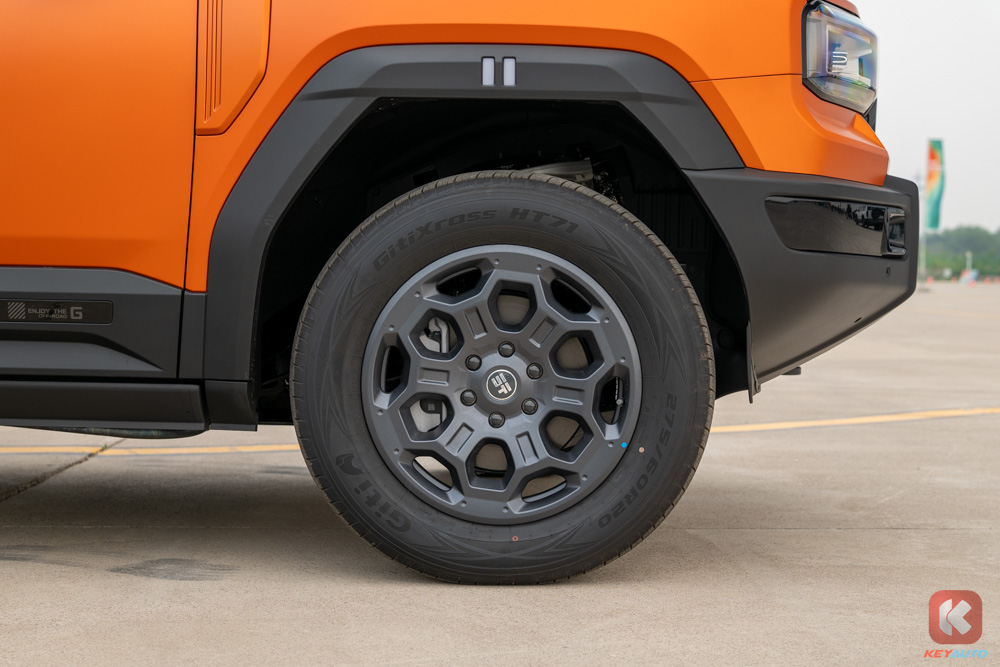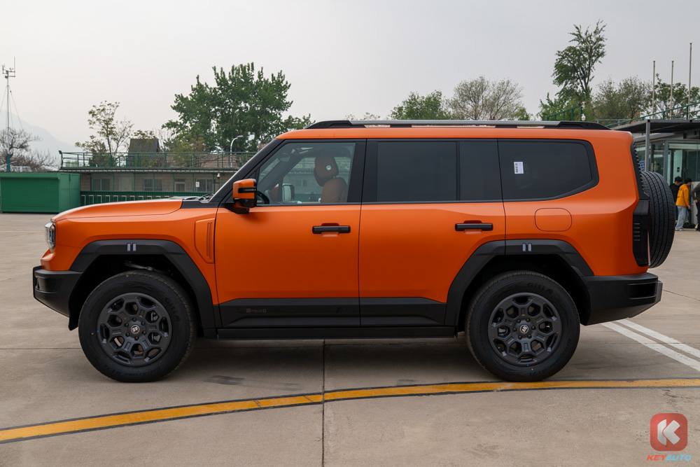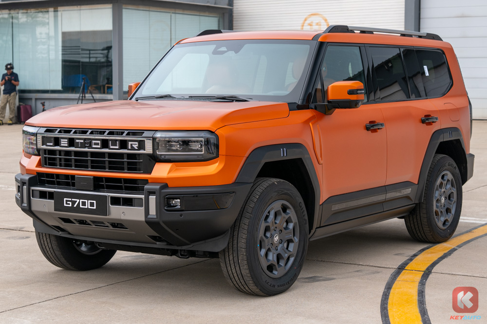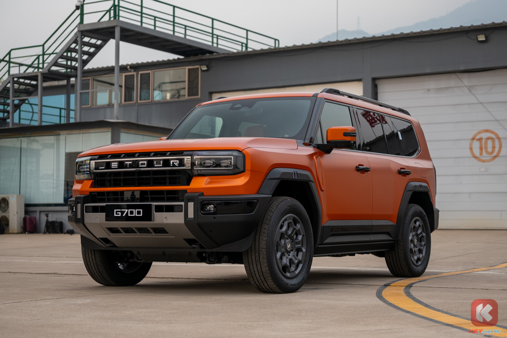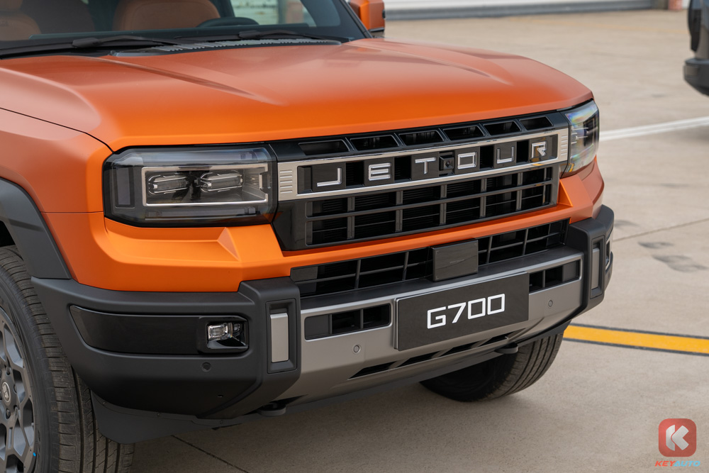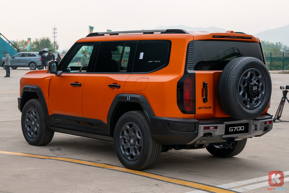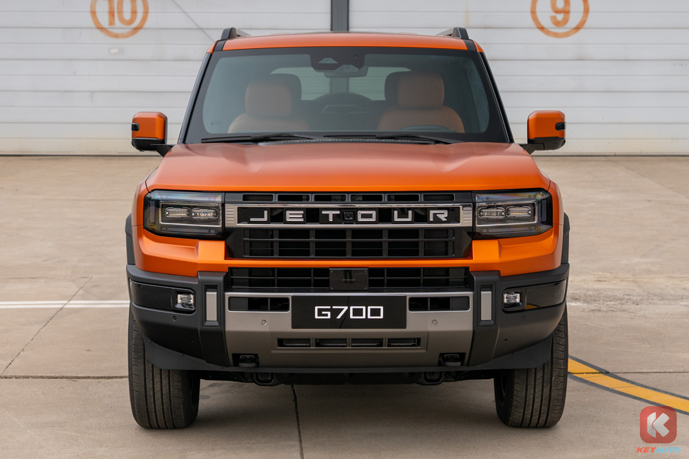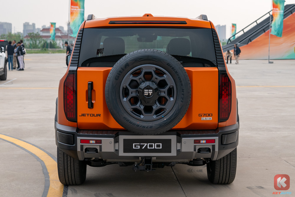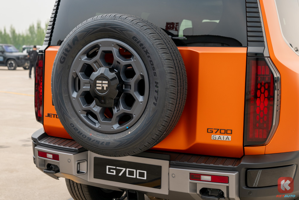 外观造型可看作是 Jetour T2 的放大版本,前脸印有品牌名称的格栅造型,搭配大尺寸轮圈和外挂式备胎,整体观感极具硬汉风格。当然了,作为一台可越野的车种,G700 同样拥有强大的涉水能力,官方宣称可达到 970mm!