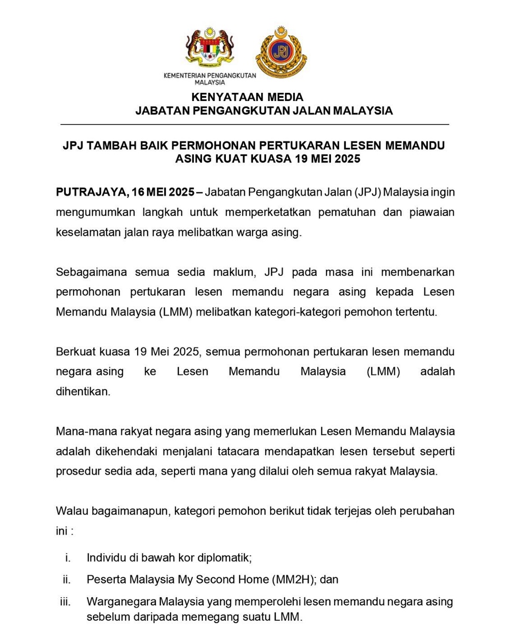 马来西亚陆路交通局(JPJ)宣布,从即日起外国人不能直接将海外驾照转换马来西亚驾照,只有特定群组例外!