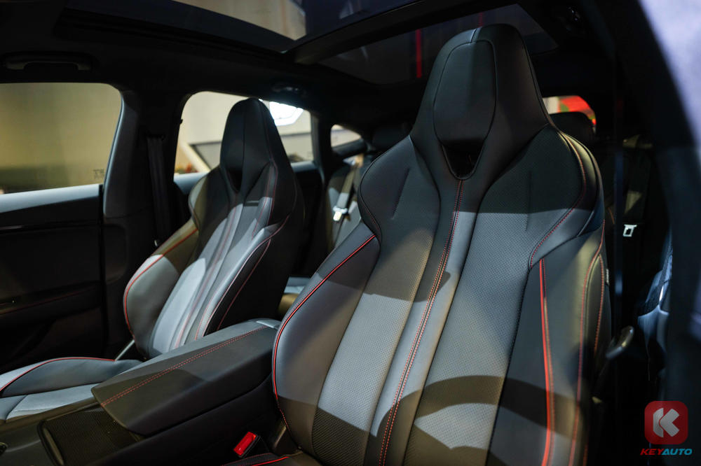 The car's cabin features a sport steering wheel with paddle shifters, a 12.3-inch touch screen infotainment that supports Apple Carplay and Android Auto, Bose sound system, wireless charger, bucket leather adjustable seats (6-way for driver, 4-way for passenger), 360-degree camera with sensor, and panoramic sunroof.