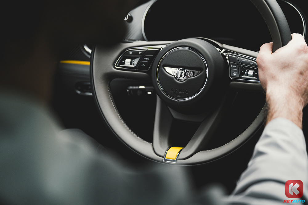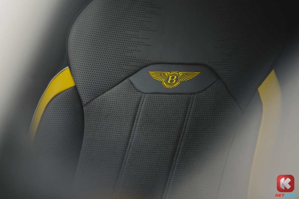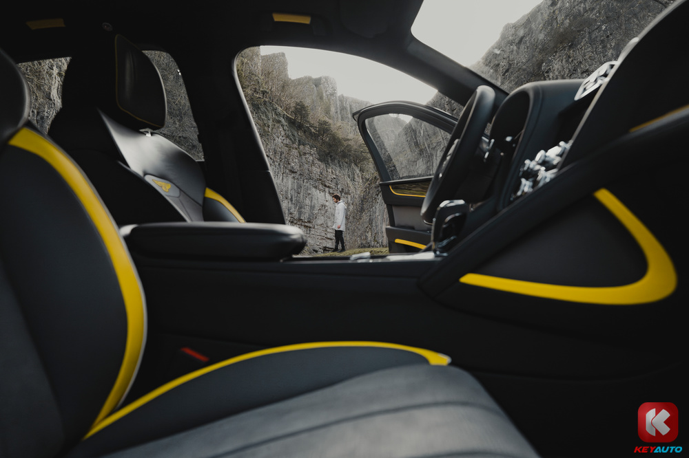 Cyber Yellow 依旧是车内的点缀色调,从内饰皮革、座椅徽章、到饰板和地毯。Bentley 对细节的关注在精致的触感中显而易见,譬如将 Bang&Olufsen 音响设置于缎面黑和银色格栅之中。
