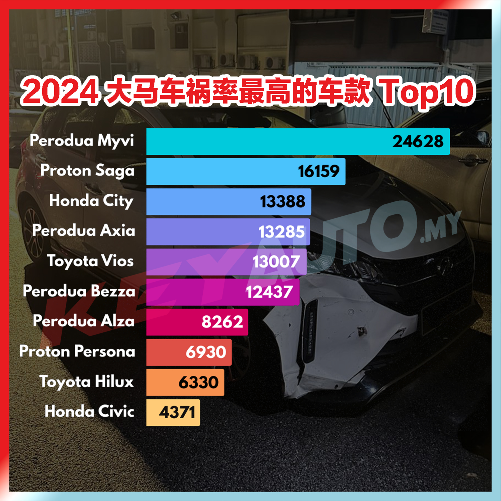 2024 年大马车祸率最高的车款 Top10:Perodua Myvi 拿下第一名,全年共有 24,628 宗