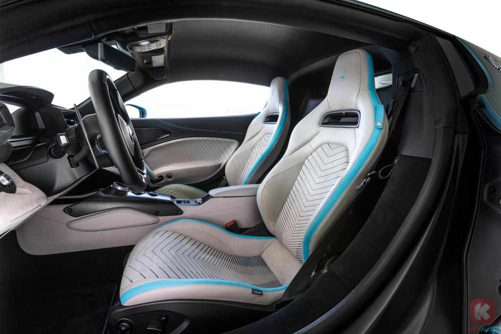 至于 MC20 “ Iris ”则采纳 “ AI Aqua Rainbow ” 涂层配上白色条纹,车内的皮革与缝线也采用同样风格,与白色内饰形成明显对比。车子搭载3.0L Nettuno V6双涡轮增压引擎,最高马力621匹。