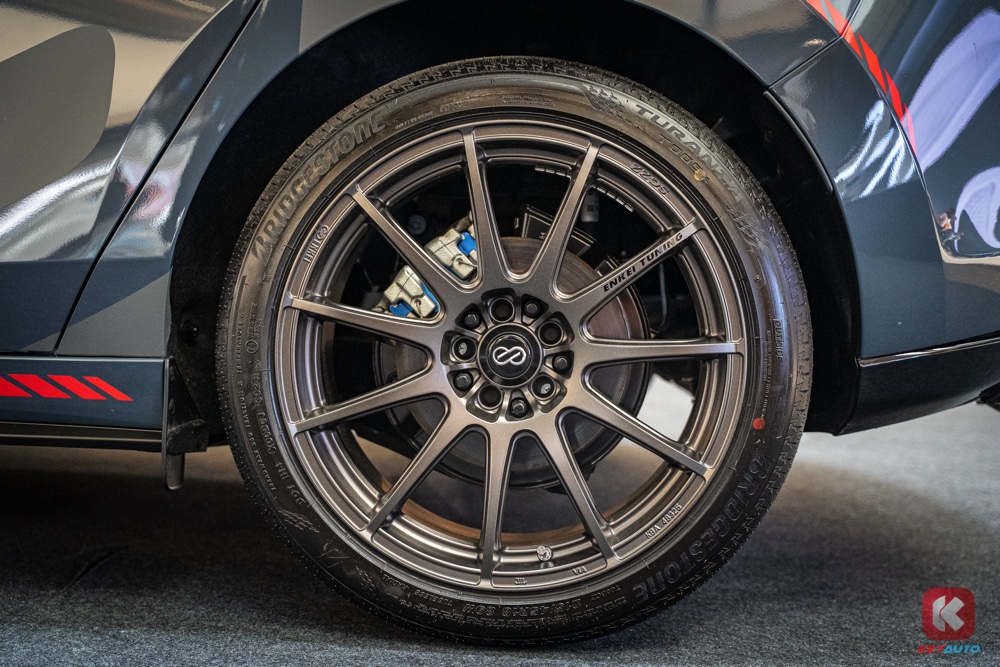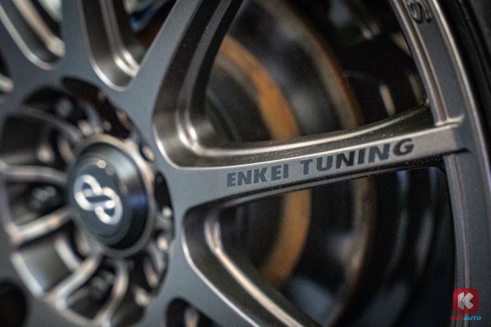 轮圈的部分改为 Enkei Tuning SC22 轻量化轮圈,配上 Endless Super Street S-Sport 煞车片,尾翼是黑色亮面烤漆和红色贴纸,加大对排气管也设有 MS 标志。