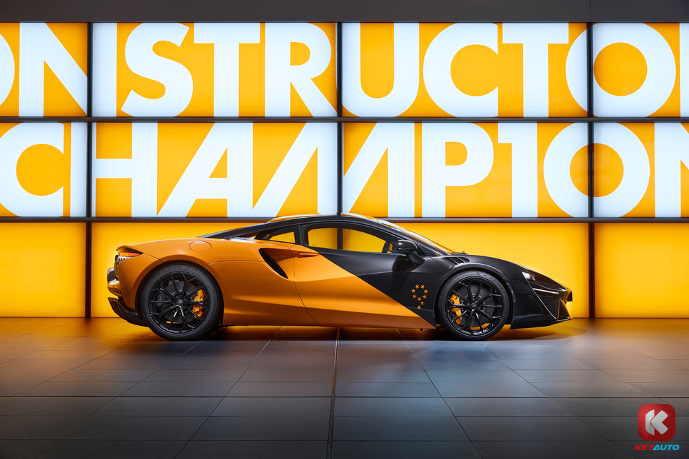 驾驶员侧的可视碳纤维延申门槛盖(Visual Carbon Fiber Extended Sill Cover)上设有车手 Lando Norris 和 Oscar Piastri 的签名,而座椅头枕的部分设有冠军桂冠标志。