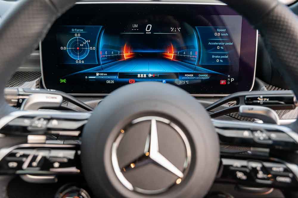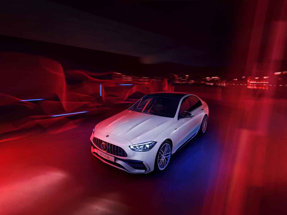 The C 43 4MATIC's 2.0-litre four-cylinder engine produces a rated output of 300 kW (408 hp) at 6750 rpm and a maximum torque of 500 Nm at 5000 rpm. An additional temporary boost of 10 kW (14 hp) is available through the belt-driven starter generator (RSG), which acts as a mild hybrid and enhances efficiency through functions such as gliding and recuperation. The vehicle accelerates from 0 to 100 km/h in just 4.6 seconds and has an electronically limited top speed of 250 km/h. The AMG sports braking system ensures exceptional deceleration and control, with ventilated and perforated brake discs fitted on both axles.