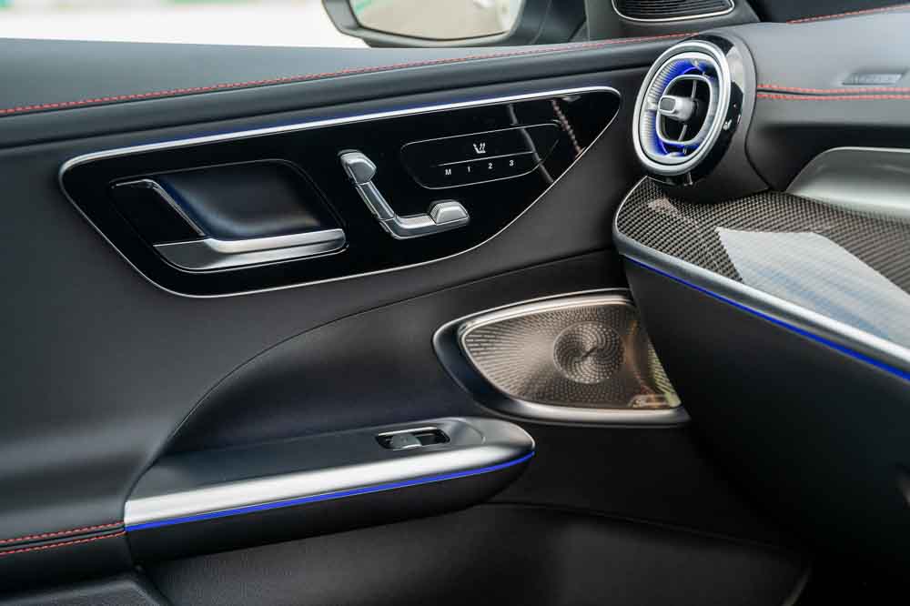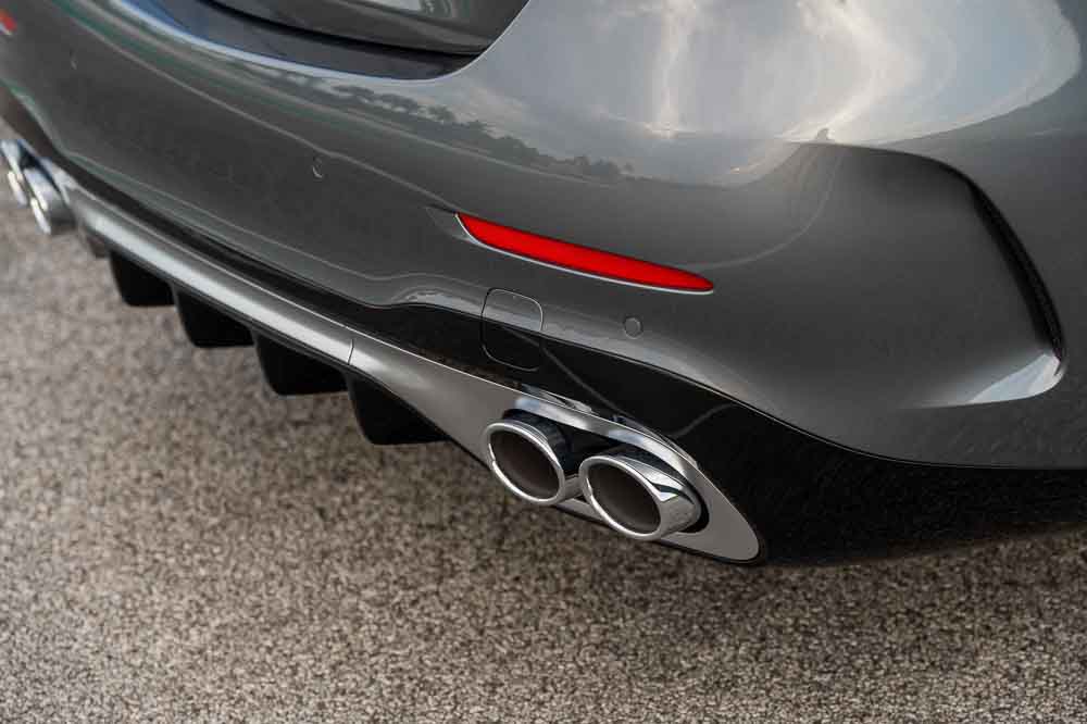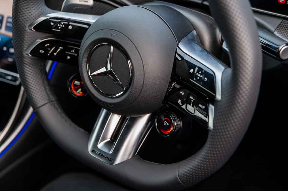 The AMG exhaust system offers a sporty engine sound, adjustable based on the selected drive program, providing a range of acoustic experiences from balanced to sporty. The exterior features AMG-specific details such as the radiator grille with vertical chrome struts, an AMG front apron, side sill panels, a diffuser-look rear apron, and round twin-tailpipe trim elements. A panoramic sliding sunroof and DIGITAL LIGHT technology further enhance the driving experience.