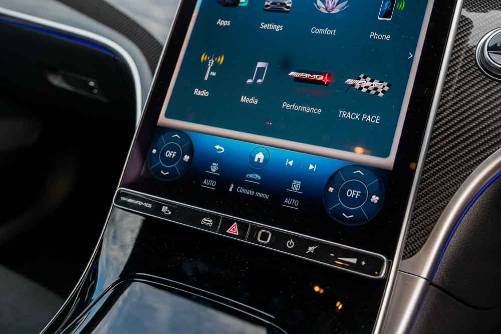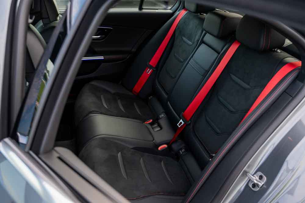 Inside, the AMG C 43 4MATIC is equipped with AMG seats featuring ARTICO man-made leather and MICROCUT microfiber upholstery with red contrasting stitching, as well as an AMG Performance steering wheel. The instrument panel and beltlines are upholstered in ARTICO man-made leather with red topstitching. The 12.3-inch driver display and 11.9-inch central display house the MBUX infotainment system, which includes AMG-specific displays and functions, AMG TRACK PACE data logger, MBUX augmented reality for navigation, hard-disc navigation, fingerprint scanner, Apple CarPlay, Android Auto, and ambient lighting.