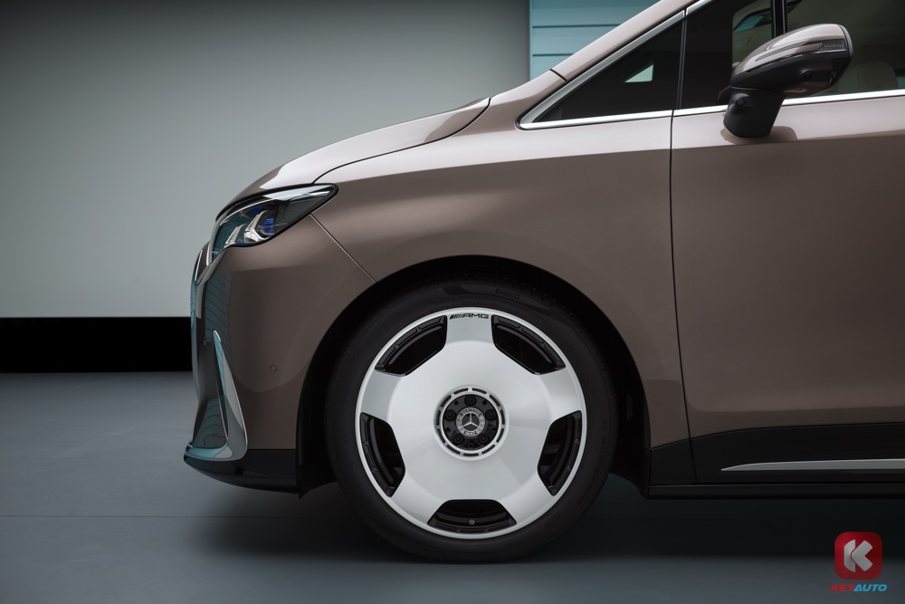 新车的前脸是醒目的格栅,两侧是三芒星设计灯组,引擎盖中央则是直立的厂徽。车侧是隐藏式门把,配上电动侧滑门;车尾则是弧形尾灯,尾灯与扰流板结合为一体。新车备有 19-22 寸的轮圈供选择。车主亦可选配 AMG Line 套件,包括更具运动感的前保险杆、点阵式发光格栅、标志性的星形格栅等。