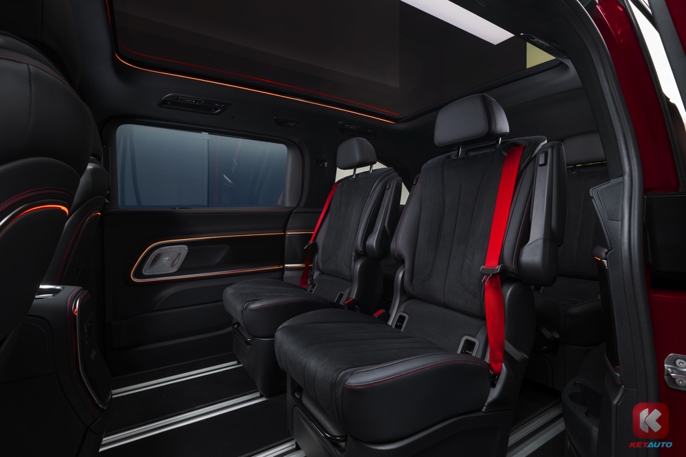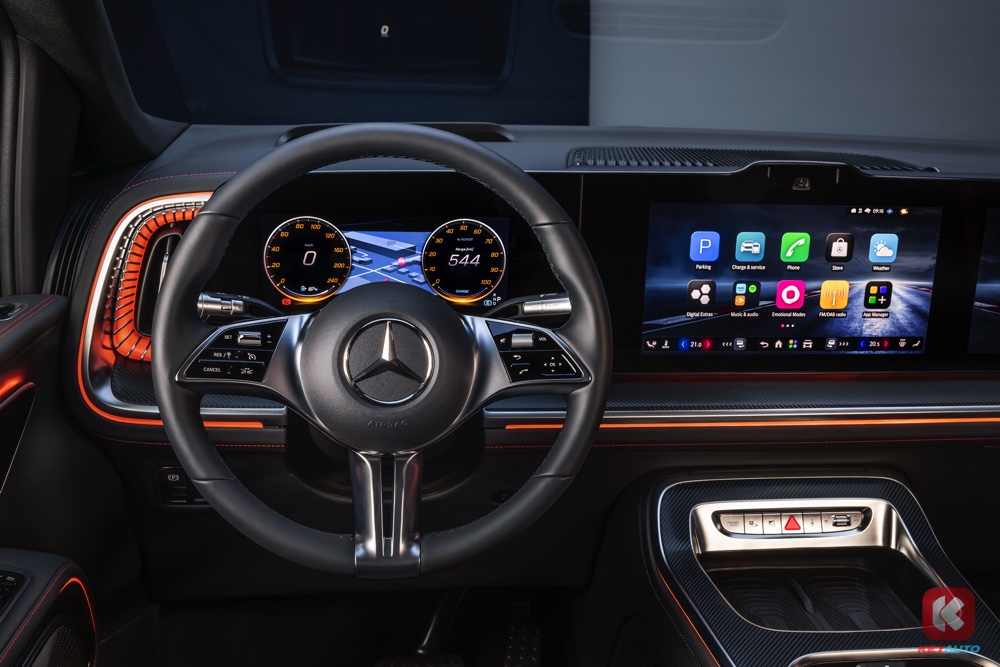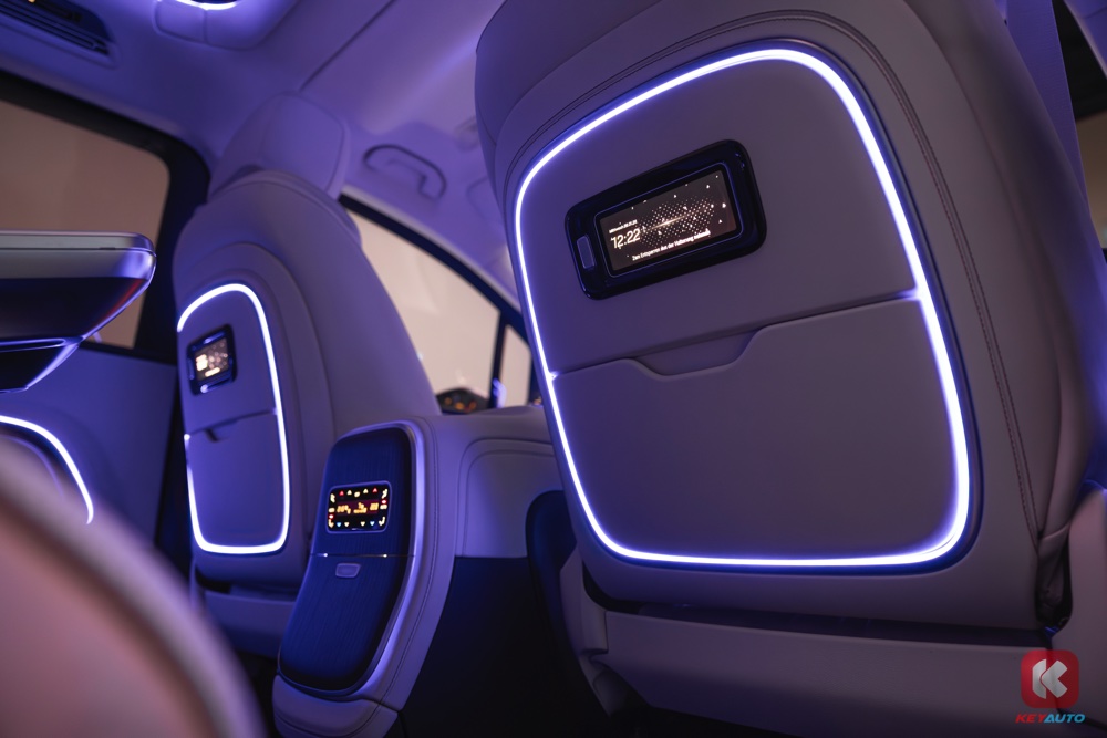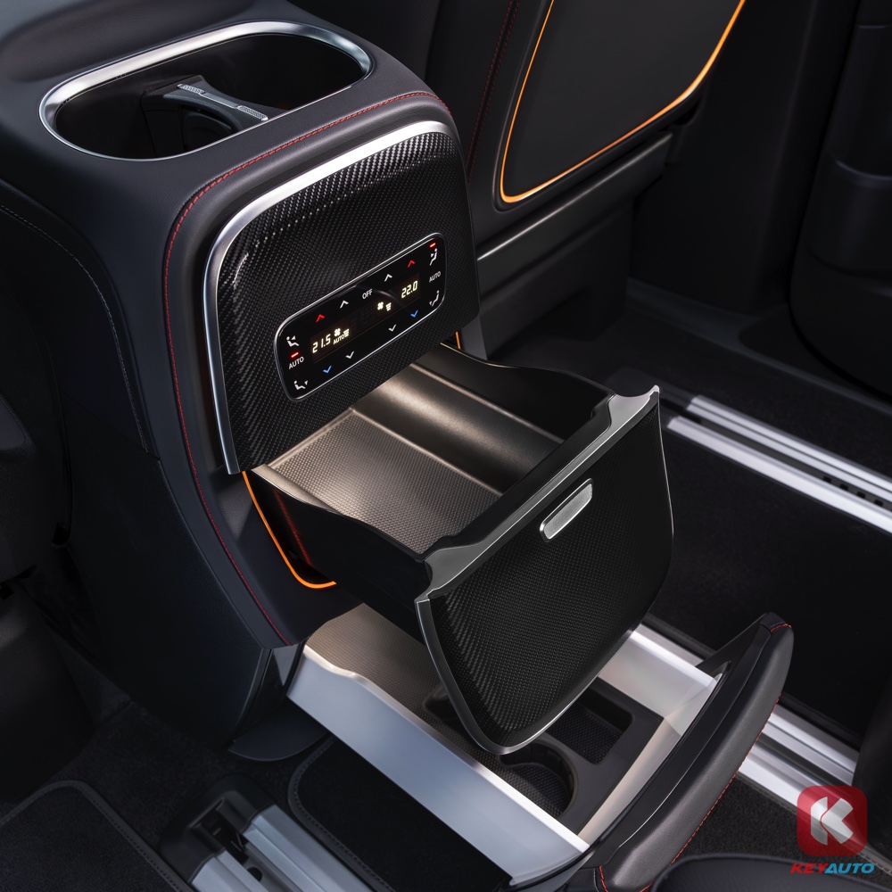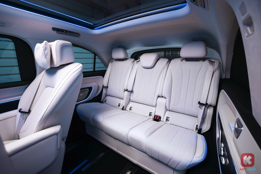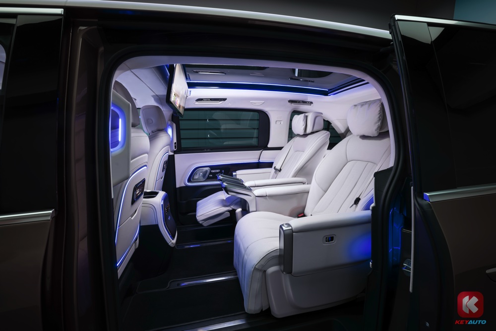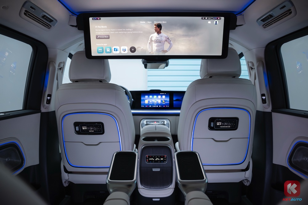 车内延续了家族设计风格,可选装 MBUX 超级屏幕,包括 10.25 寸全液晶仪表版、14 寸中控荧幕以及 14 寸副驾座影音娱乐荧幕。车主也可选配后排娱乐系统——31.3 寸的吸顶式荧幕。官方提供 3 种中央鞍座配置供选择:单/双手机无线充电、带扶手和开放式储物空间,或配备两个冷暖储物空间。其他配备包括 22 具扬声器 Burmester 3D 环绕立体音响系统、Sky View 全景玻璃天窗等。