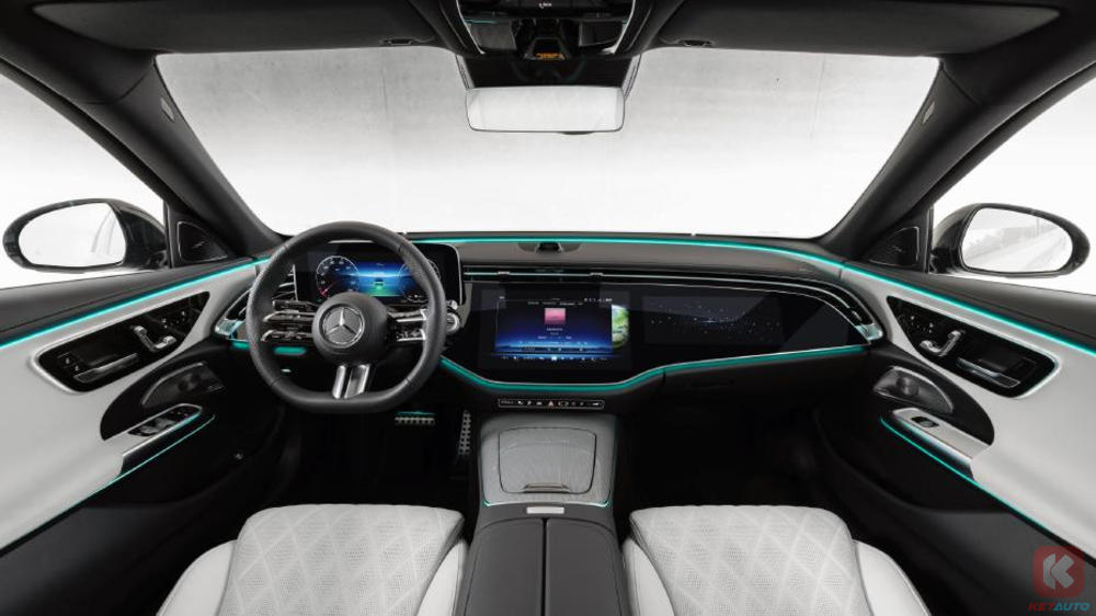 内装的部分,全新 E-Class 搭载的是三连屏幕,也就是仪表板+萤幕主机+副驾荧幕连成一体。出风口则设计再荧幕上方,达到隐藏的效果。14.4 寸中控萤幕搭载了 MBUX 系统,支援多种游戏和通玄软件,甚至可以在车上进行视像会议。其他配备包括 Burmester 4D 环绕音响系统、车内氛围灯、Spatial Audio 功能等。