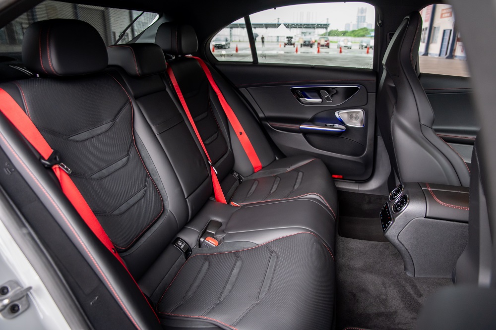 The interior comes in contrast of black and red with AMG Performance seats in exclusive black Nappa leather upholstery - complete with red decorative topstitching and embossed AMG emblems in the front head restraints.