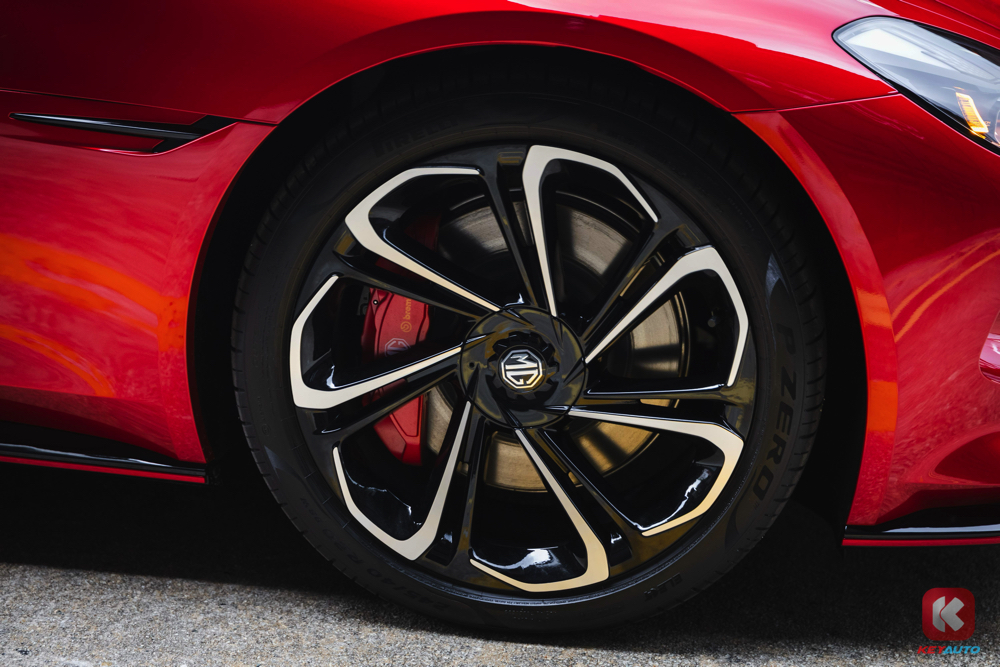 MG Cyberster 采用了软顶敞篷设定,具备无边框剪刀门设计、20 寸 Jetstream 铝合金轮圈、红色刹车卡钳、LED 自动头灯组。