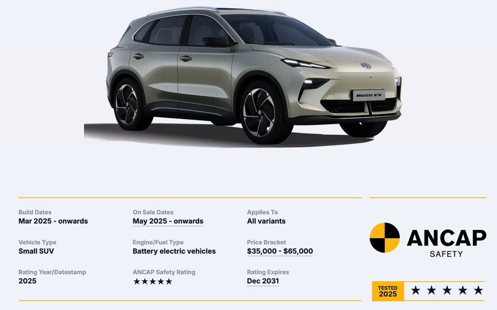 MG S5 EV 获 ANCAP 五星安全评级