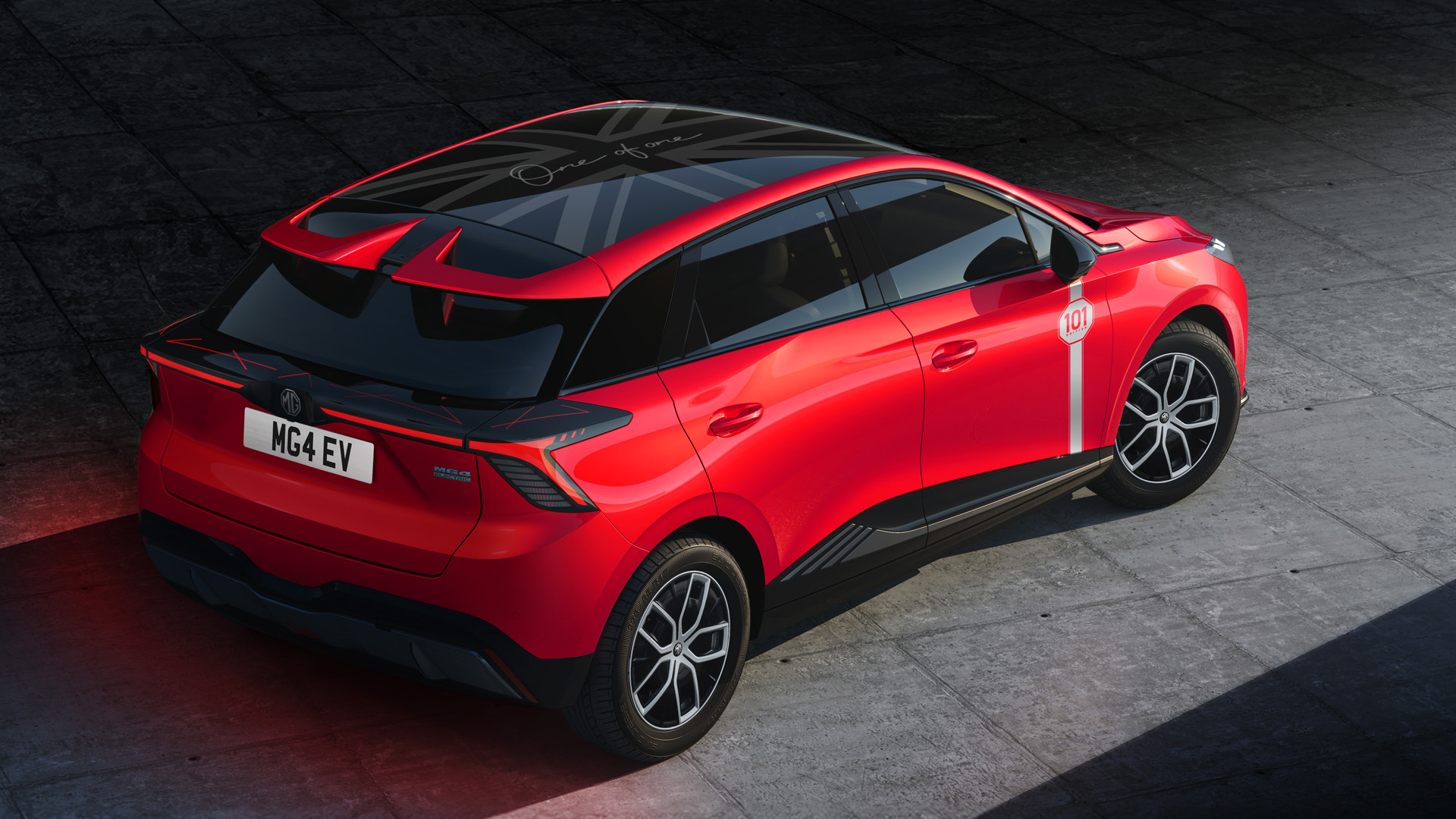 这款 MG4 101 Edition 是基于 MG4 Lux Extended Range 版本 “加料” 而来,加了 101 周年车身拉花、和英国国旗 “Union Jack” 车顶拉花并加有 “One of one“ 手写字样。