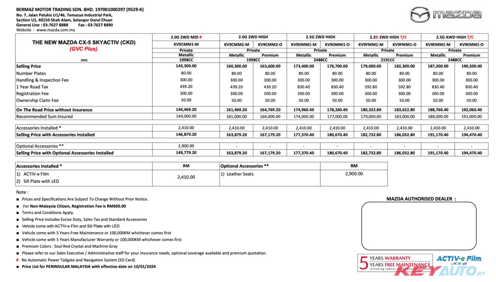 大马 Mazda 总代理 Bermaz Auto 今天正式在本地发表 2024 年式的小改款 Mazda CX-5,新车在吉打州 Kulim 进行本地组装(CKD),同样提供 5 个等级,售价从 RM144,469 起(不含保险)。