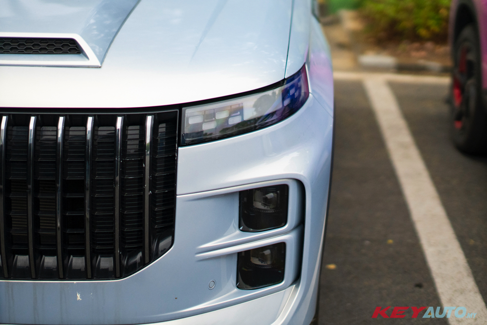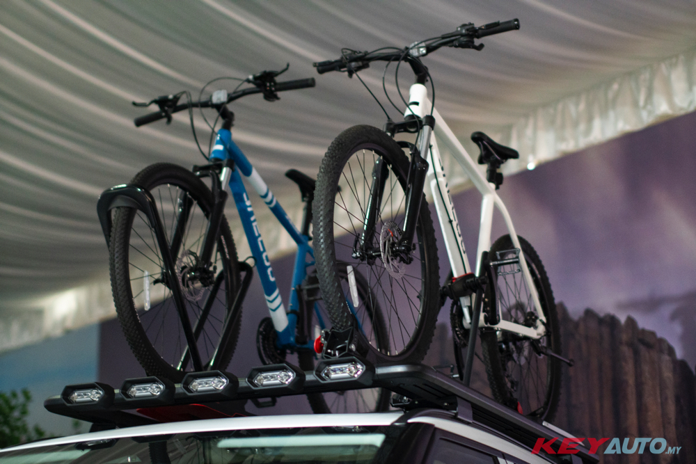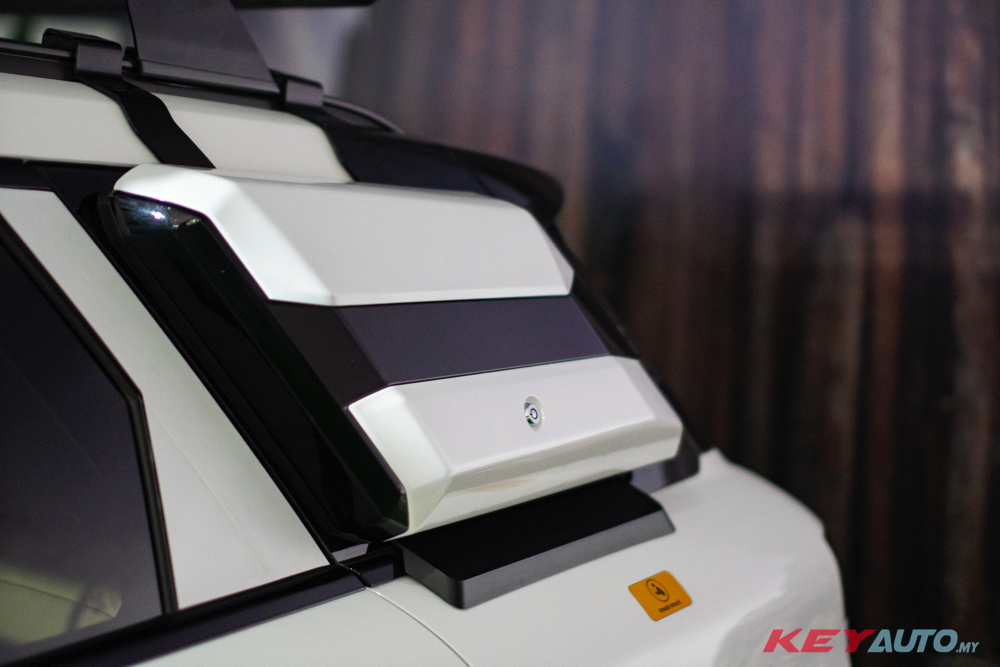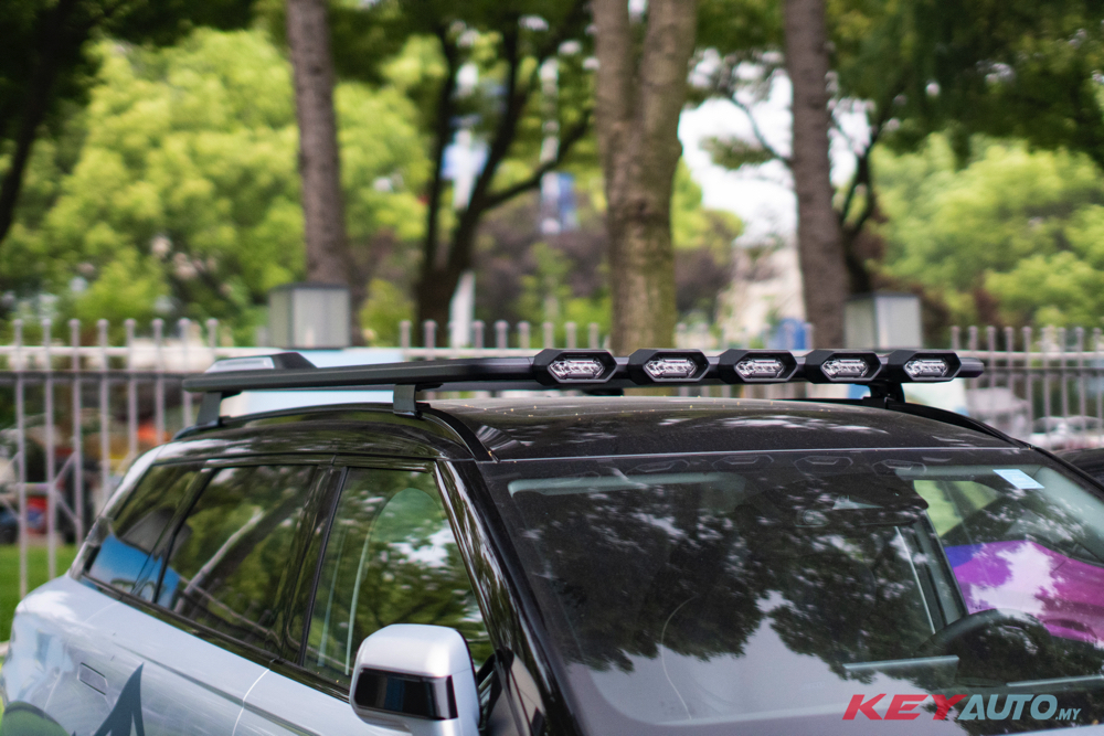 这台 JAECOO J7 安装的越野配件,包括引擎盖上的进风口装饰,让外形看起来更霸气;车顶上有行李架和 LED 照明,还可承载两台脚踏车;而 C 柱旁也有置物箱,提升实用性。