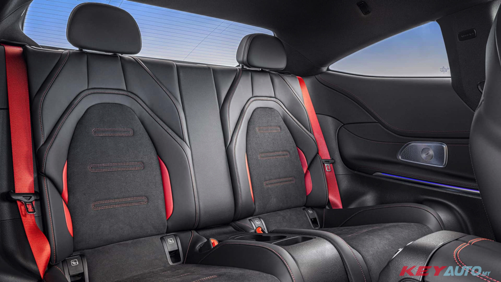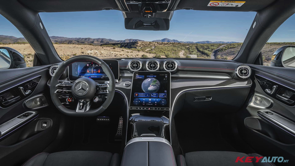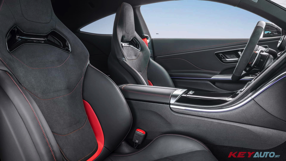 内装沿用了新世代家族设计,在舒适豪华的基础上,导入一些运动元素,配备 AMG Performance 方向盘和桶形座椅,更多的碳纤维饰板,配上红色缝线和安全带。
