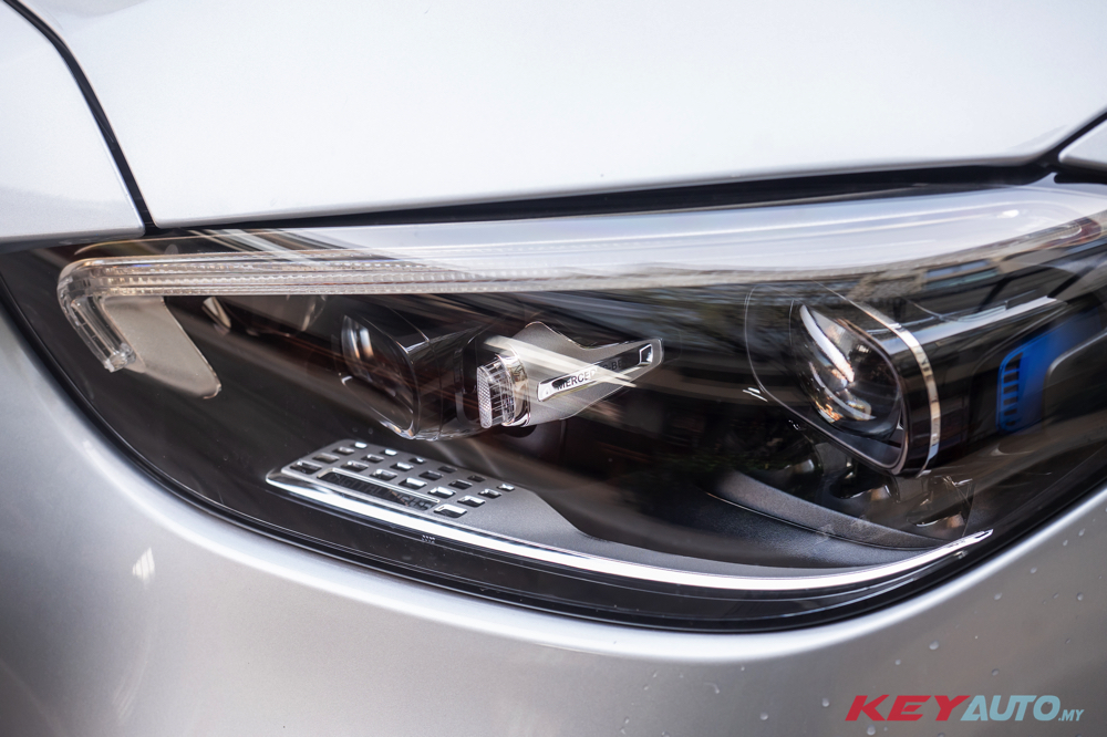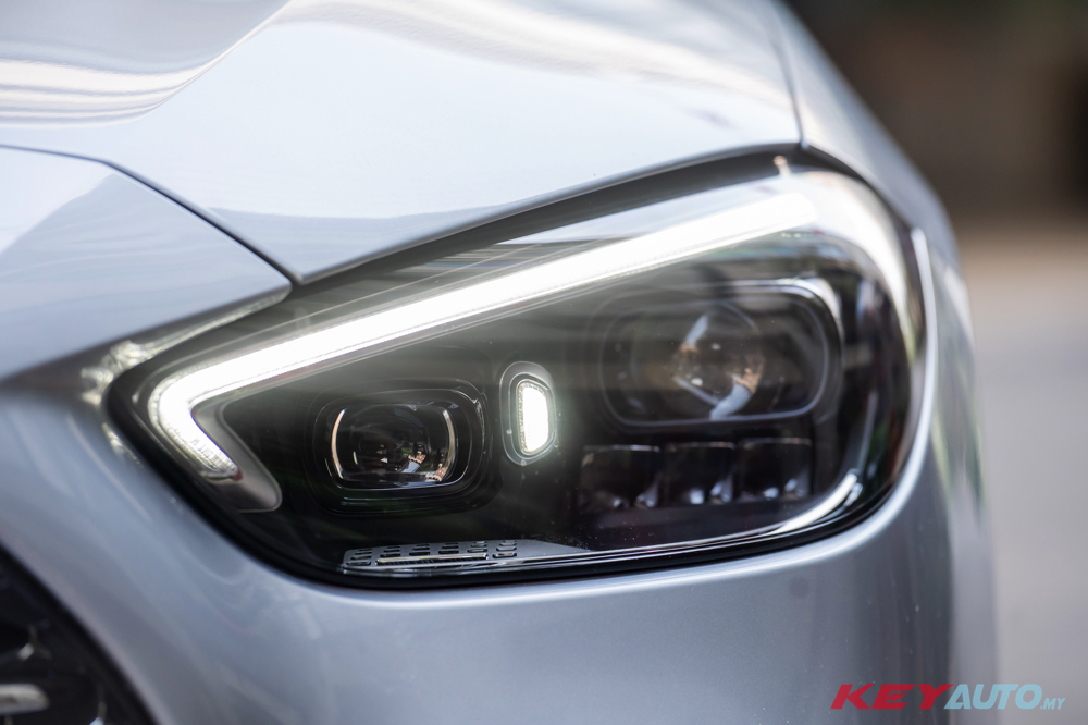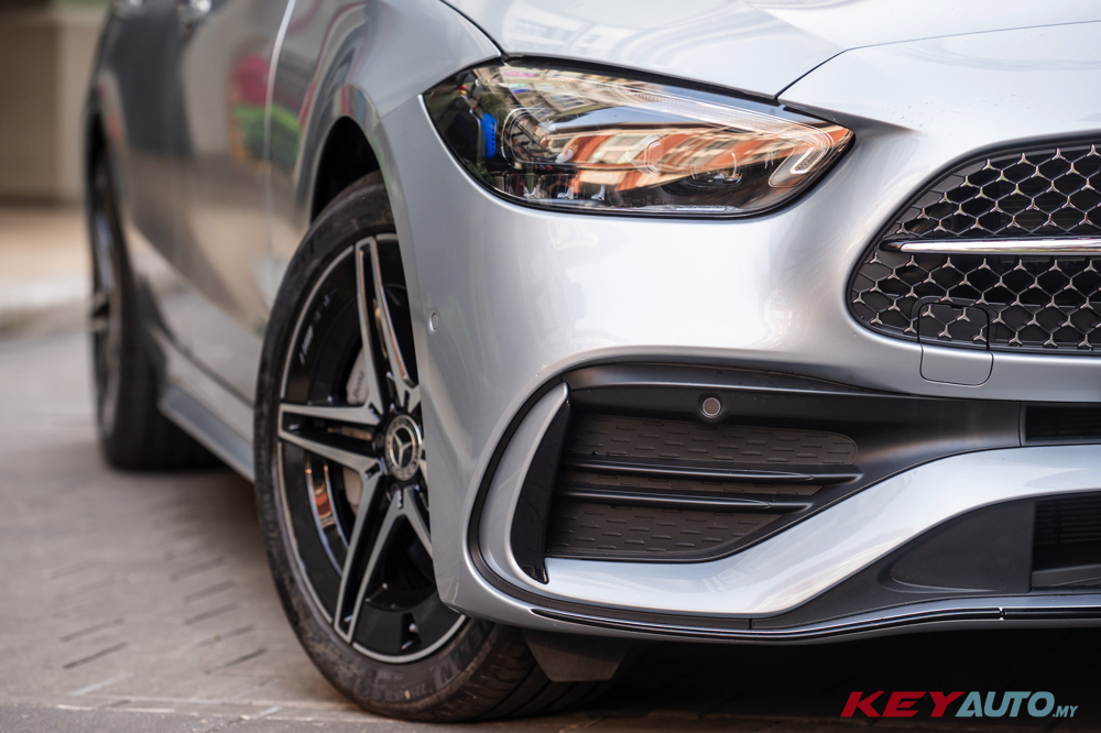 C350e 外观配备了 AMG Line + Night Package 运动化套件,采用 18 寸 AMG 轮圈(C300 是 19 寸)、Digital Light 头灯组和气压悬吊(后轴)。