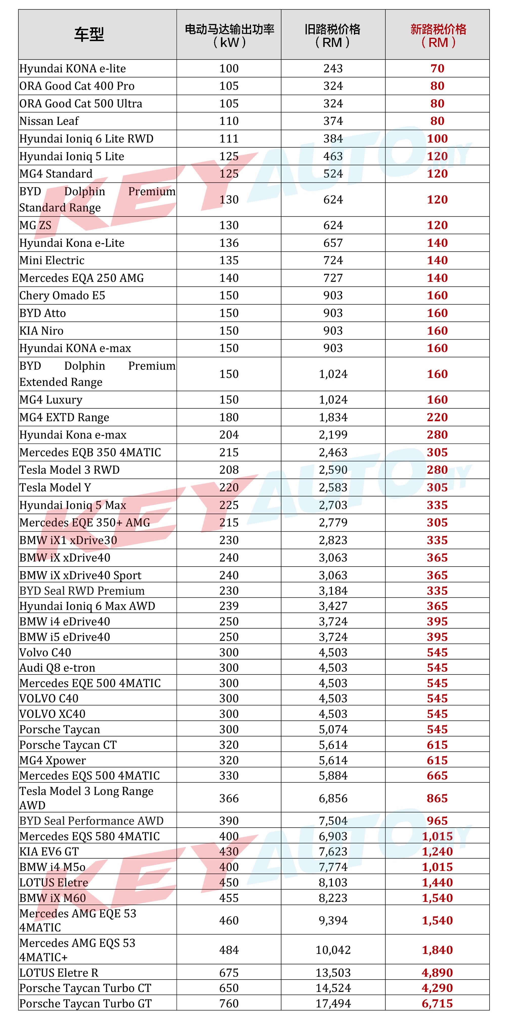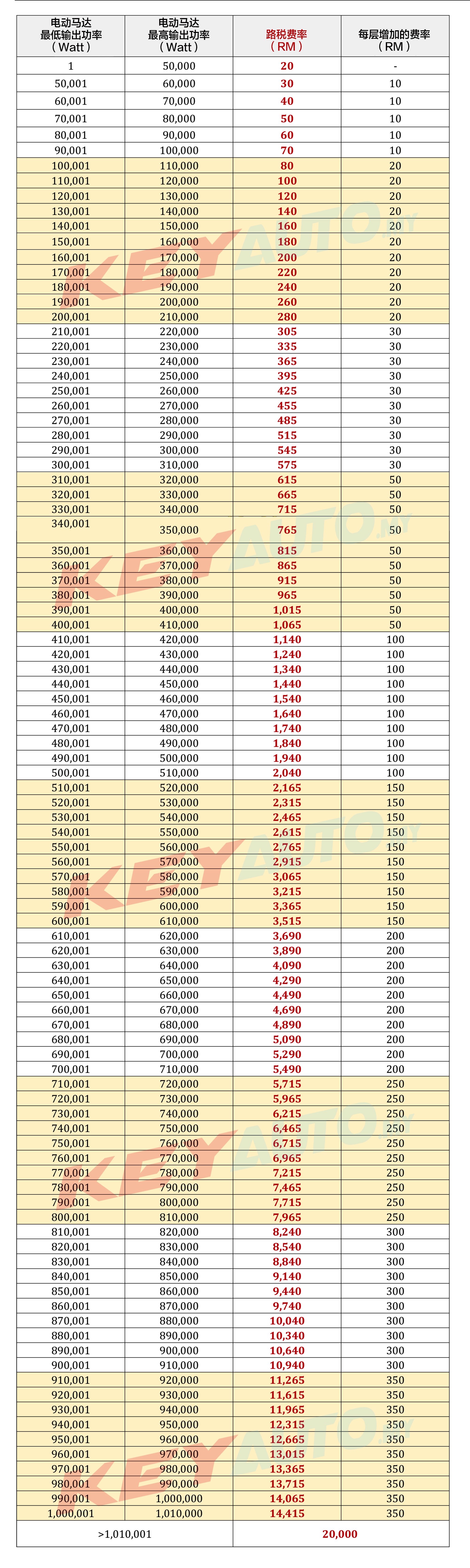 与现有的路税架构同样,新的 EV 电动车路税架构依旧是根据电动马达的输出功率(Watt,瓦特)来计算,这也意味着,电动车的动力输出越强,路税费用越贵。