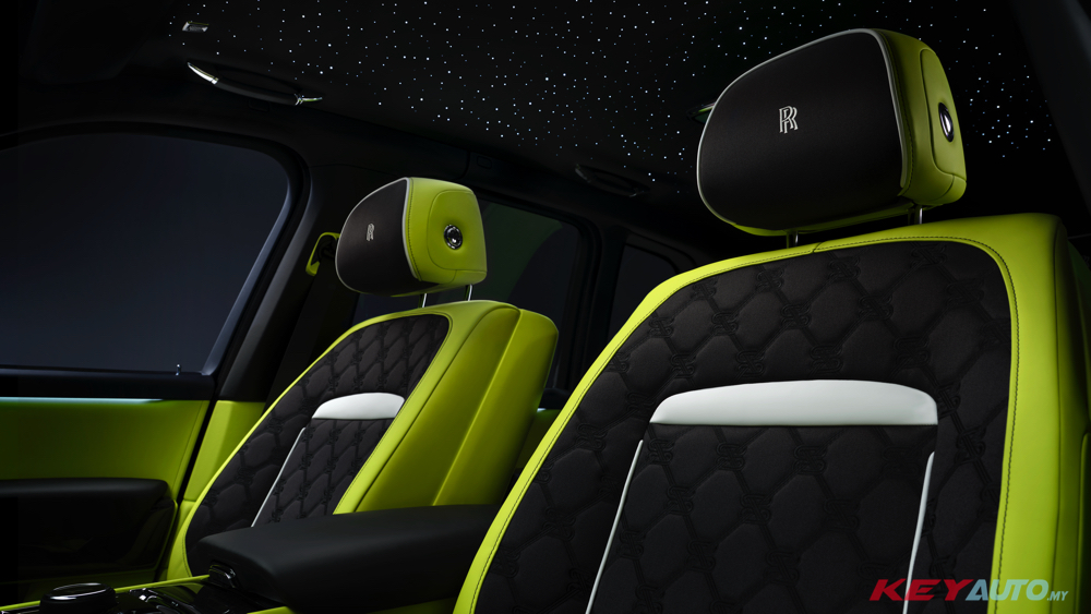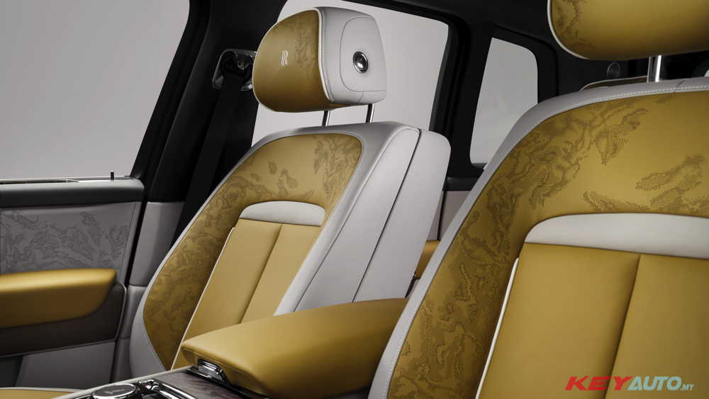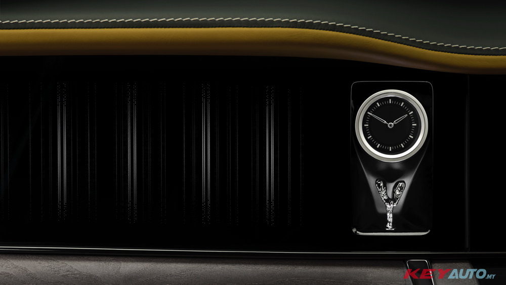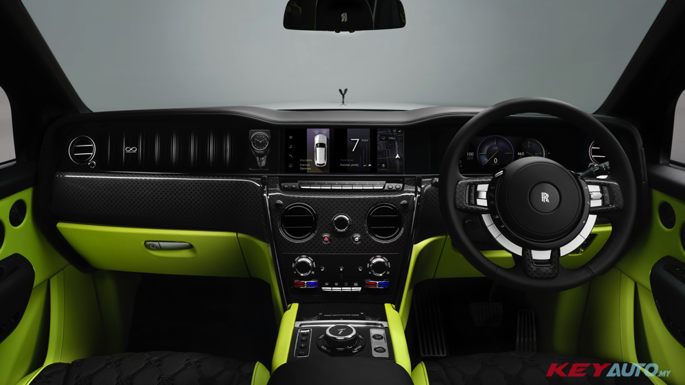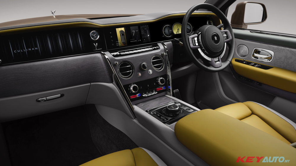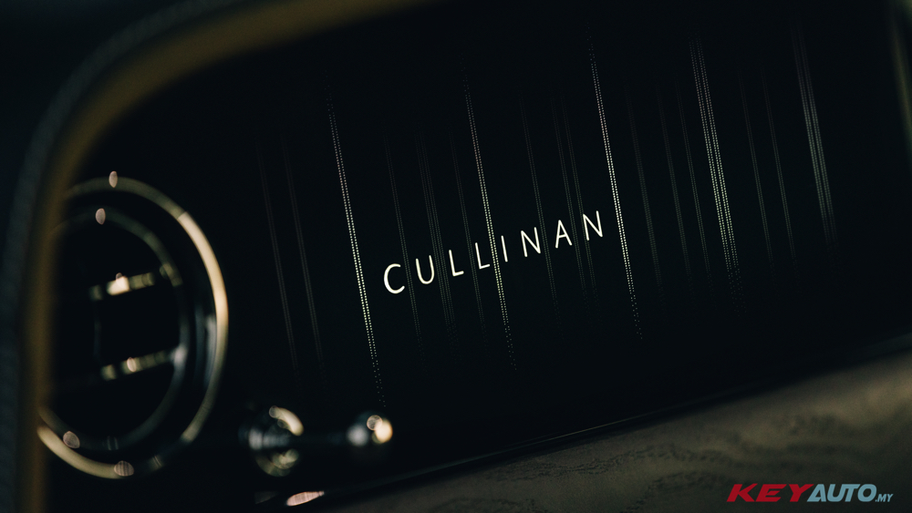 另外,时钟下方镶入欢庆女神,副驾驶前方是一块辉光面板,带有 “Cullinan” 字样和别致的都市景观图案。