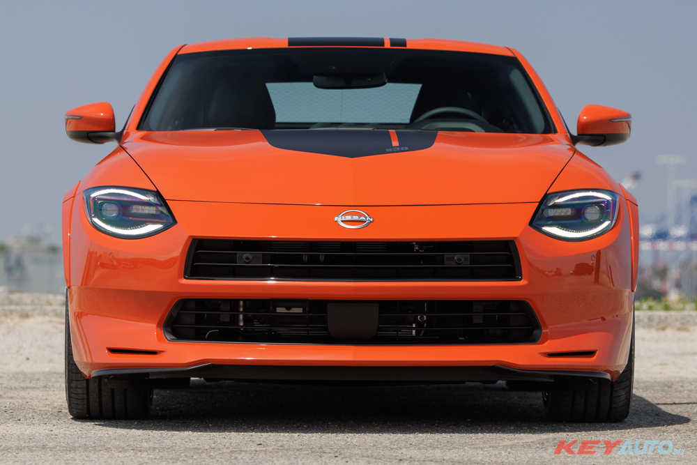 First of all, the Sight Orange body color is the original color from the 1969 240Z. It features a new front bumper with rectangular openings, distinctive wheel arches, and a set of classic 19-inch alloy wheels, showcasing the iconic look of the original Z.