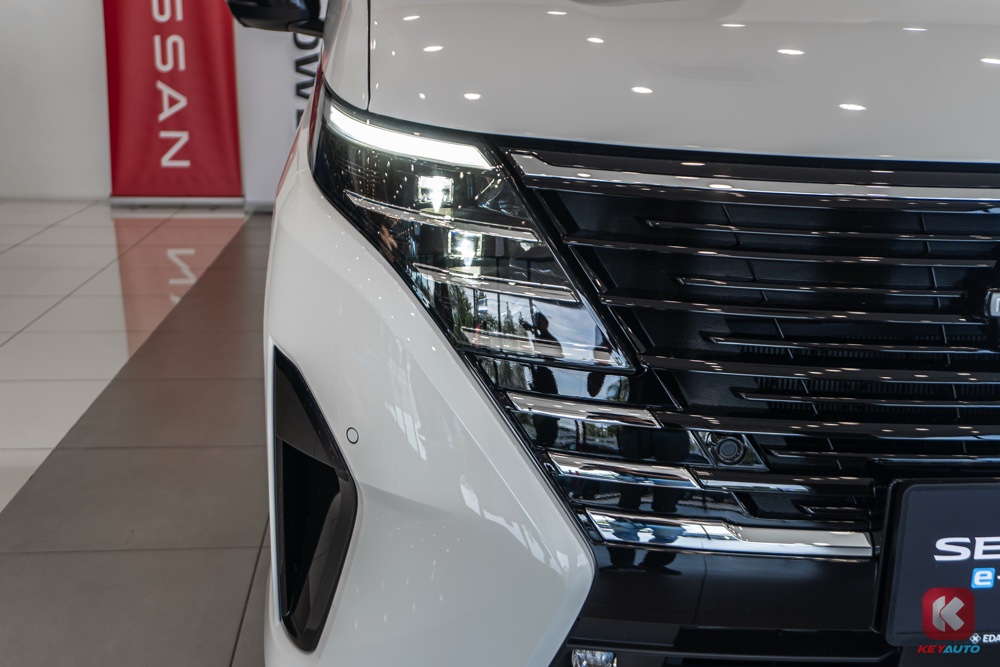 全新 Serena e-POWER 将原本的银色横条镀铬格栅改为标志性的 Nissan V-Motion 设计,换上黑色横条格栅。两侧是全新设计 V 形 LED 头灯,一直延伸到两侧引擎盖。下方是一对三角形进气口,引导气流流向前轮。