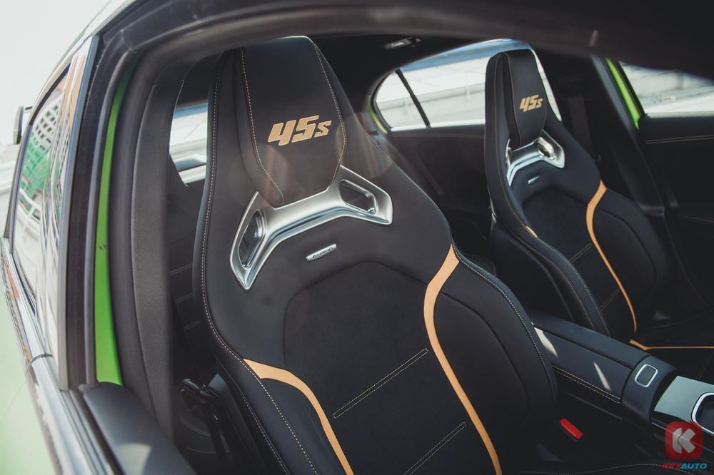 The cabin's AMG performance seats are covered in black with a combination of Artico man-made leather and Microcut microfibre while yellow decorative stitching are found in the seats, door panels and instrument panel. This also applies to the embroidered emblems with the '45 S' label in the front headrests.