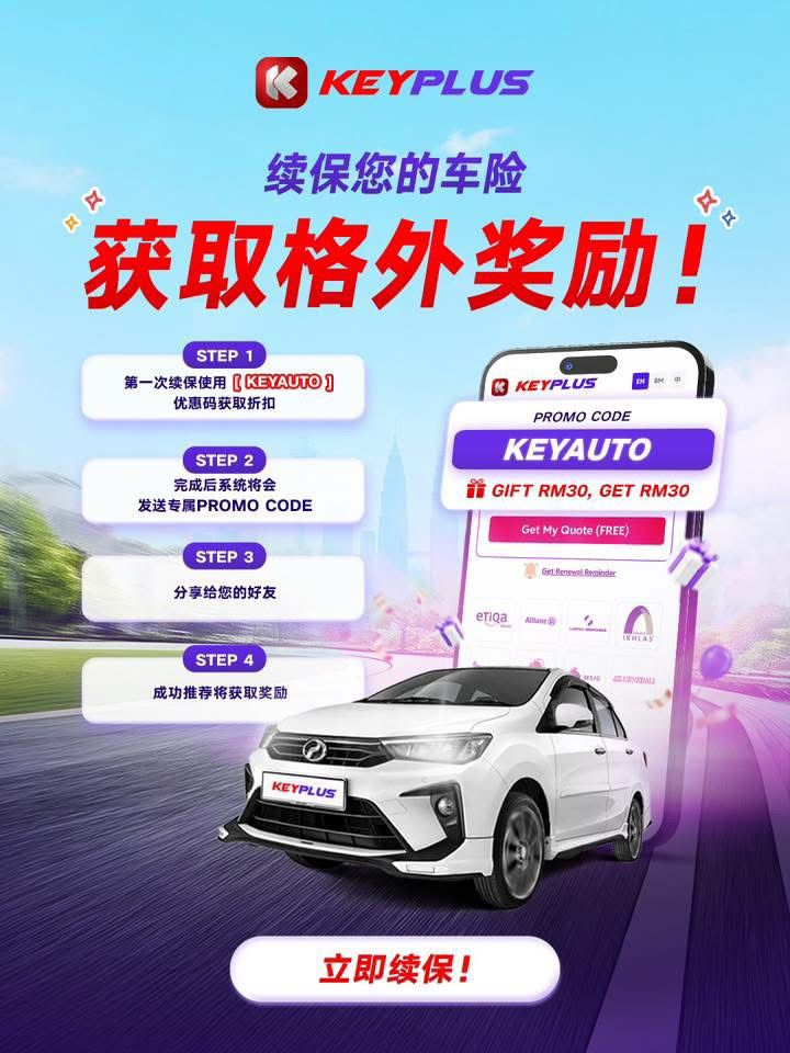 配合年终优惠,KeyPlus 推出现金回馈与优惠,只要输入【KEYAUTO】优惠码,就能直接获得 RM30 优惠,同时用个人推荐码分享给亲友时,还能额外获得 RM30 奖励。有意者可浏览 KeyPlus 官方网站,获取免费汽车保险估价。