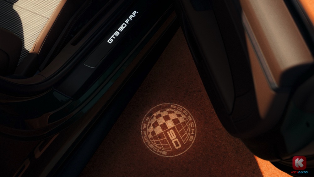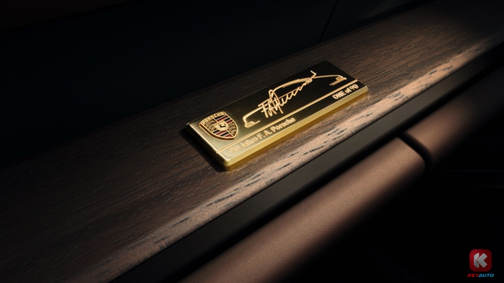 仪表板上的跑车计时码表也是源自于 F.A. Porsche 所佩戴的腕表,而换档杆上则采用开放式纹理胡桃木手柄,并且配有 F.A. Porsche 签名的铭牌。副驾座前方的饰板上也设有镀金铭牌,刻上签名以及 原始 911 车身线条,还有 “One of 90” 字样,处处彰显着其特殊之处。