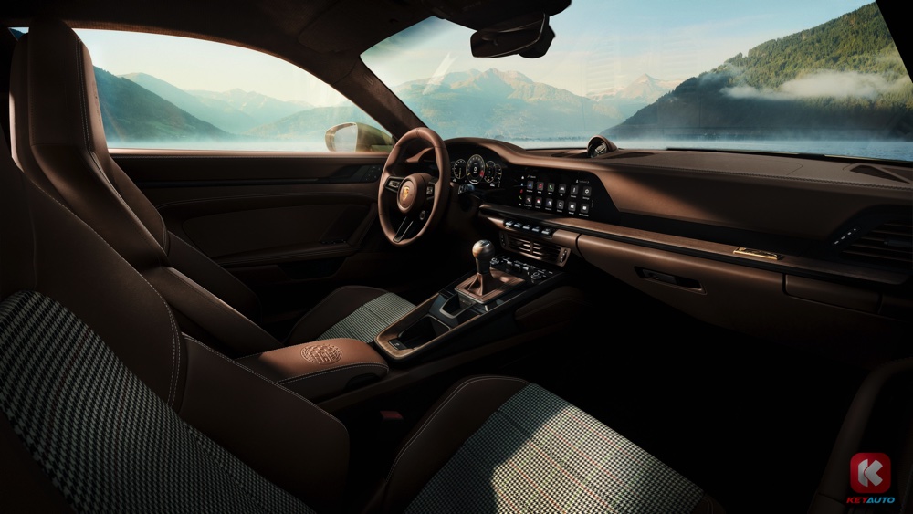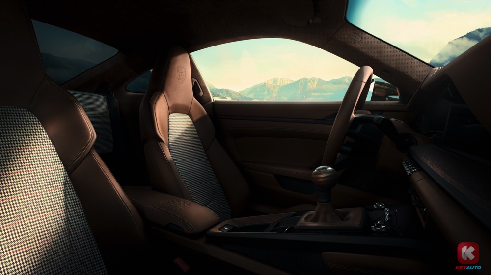 车内采用松露棕色真皮材质,配以编织面料(手套箱、公事夹和前行李箱双面地毯),那是 F.A. Porsche 生前最爱的运动外套图案。