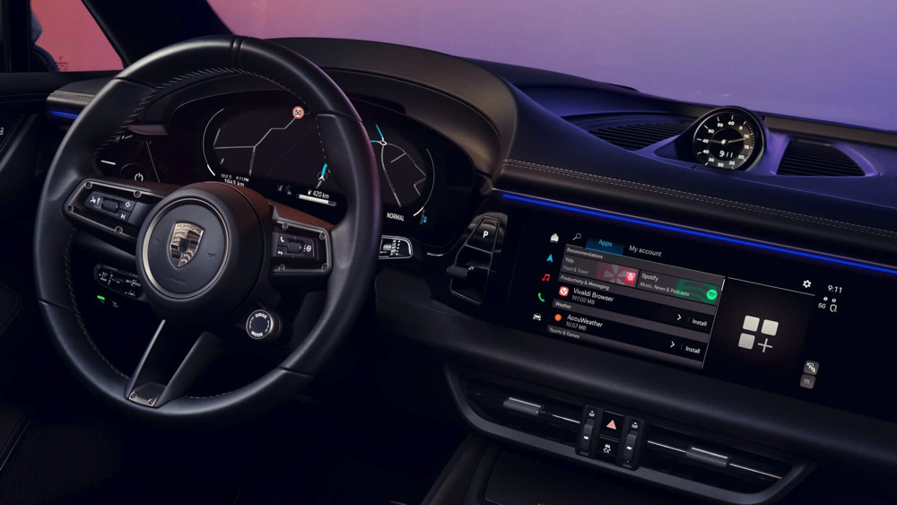 根据官方介绍,Macan EV 是采用 Android 车载系统,可透过 Porsche App Centre 获得 Spotify、YouTube、WebEx 等应用程序,当然也少不了 Android Auto & Apple CarPlay 连接功能。