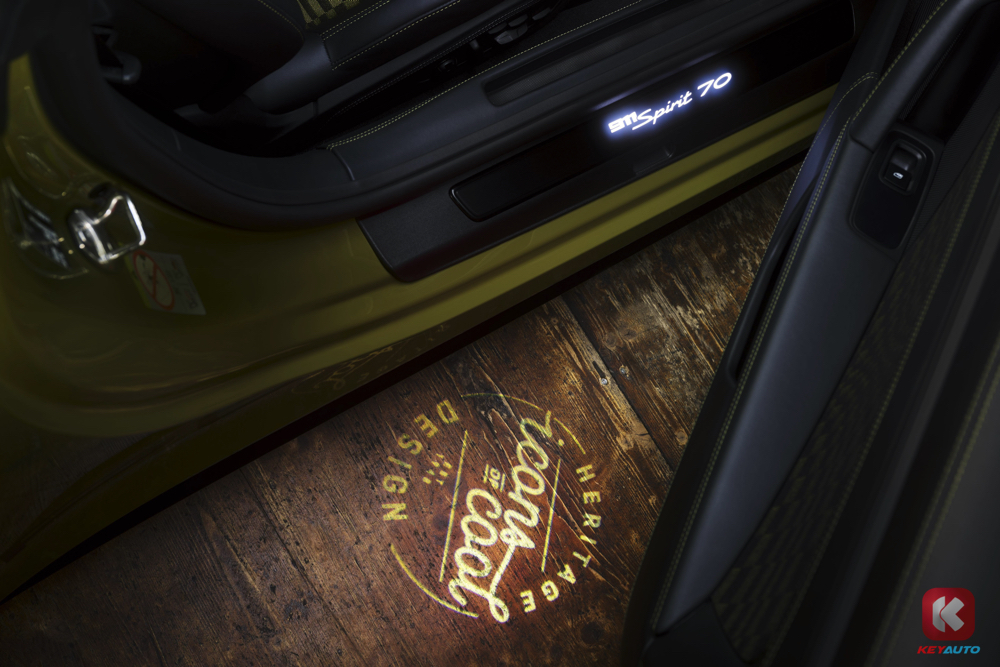外观上,获得专属 Olive Neo 车漆与 "古铜辉石" 撞色设计,重现 70 年代美学。引擎盖三道黑色丝光装饰条纹复刻当年赛道安全标识传统。