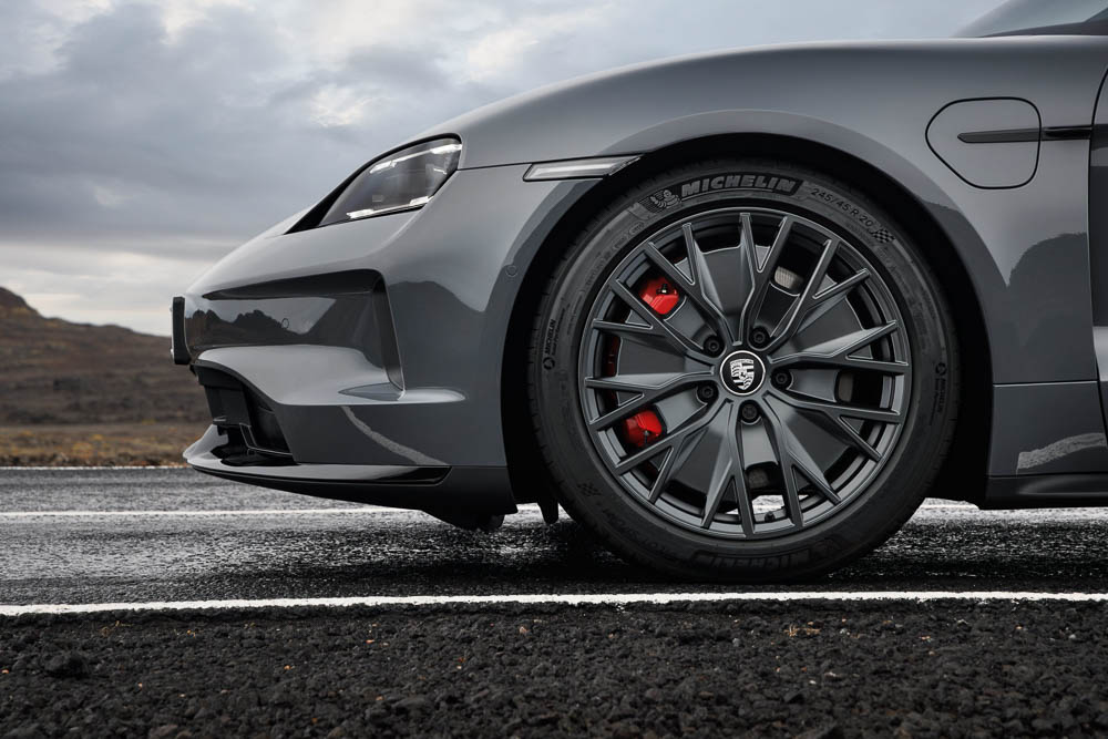 The Taycan GTS, now available as both a sports sedan and a Sport Turismo, packs up to 515 kW of overboost power in Launch Control mode. Its new push-to-pass feature provides a 70 kW power surge for 10 seconds with the press of a button. The GTS variant reaches 100 km/h in a brisk 3.3 seconds and extends range to up to 628 km under WLTP standards.