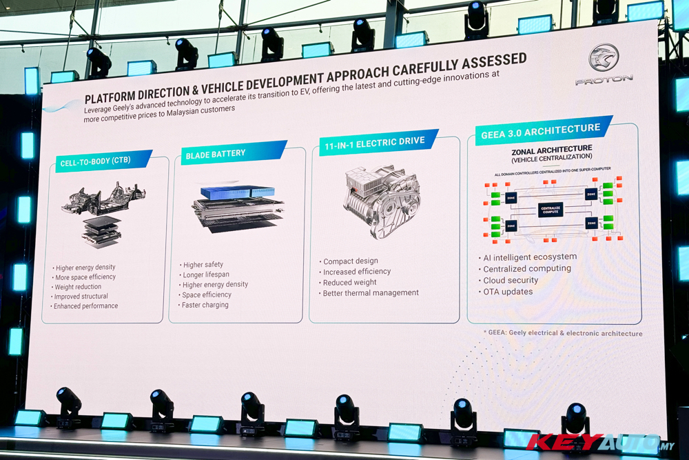 Proton e.MAS 首款车型将采用 Geely 最新的 GEA 全球智能新能源架构,预计多个先进技术都会被应用在车上,包括 CTB 电池车身一体化、银河 11 合 1 智能电驱、神盾短刀电池等。
