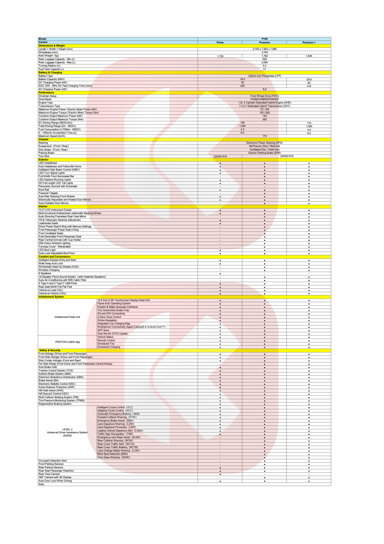Proton e.MAS 7 PHEV 分为 Prime、Premium 和 Premium Plus 三种车型。全车系统一搭载同一组动力配置,只是在电池容量上有所不同。车子采用 1.5L 四缸引擎配上两组电动马达组成的11 合 1 DHT 变速箱,综合输出 193hp/262Nm,极速为 179km/h。原厂称在无充电的情况下,油耗表现为 4.3L/100km。