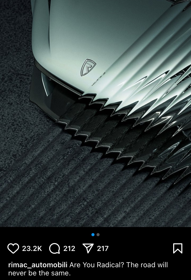 品牌在社交媒体上的预告图只展示了车头的一部分,轮廓看起来与Nevera相似,但其分流器的设计以及空气动力学套件看起来却稍有不同。贴文中特别强调了“Radical”,仿佛在暗示大家这将是一款很“Radical”(激进)的车款。这不禁让人好奇,这究竟是全新的电动跑车、进化版的Nevera还是与Bugatti Tourbillon相似的超转速V16 自然进气引擎,配上插电式混合动力呢?