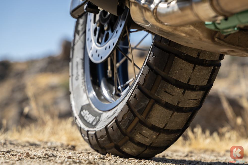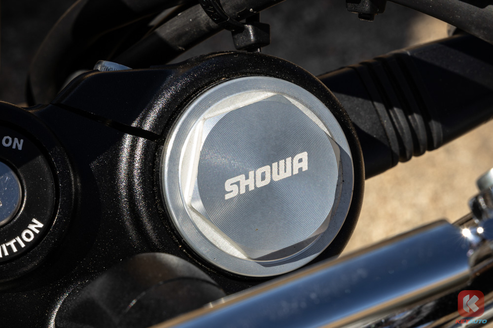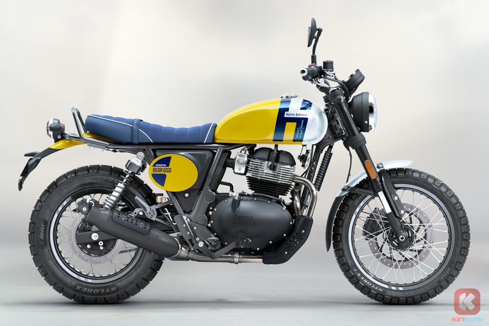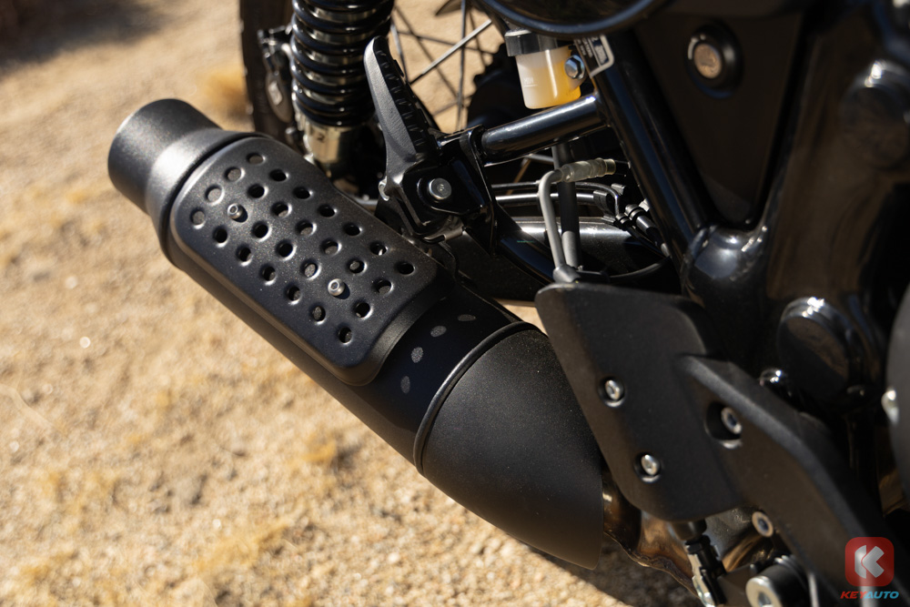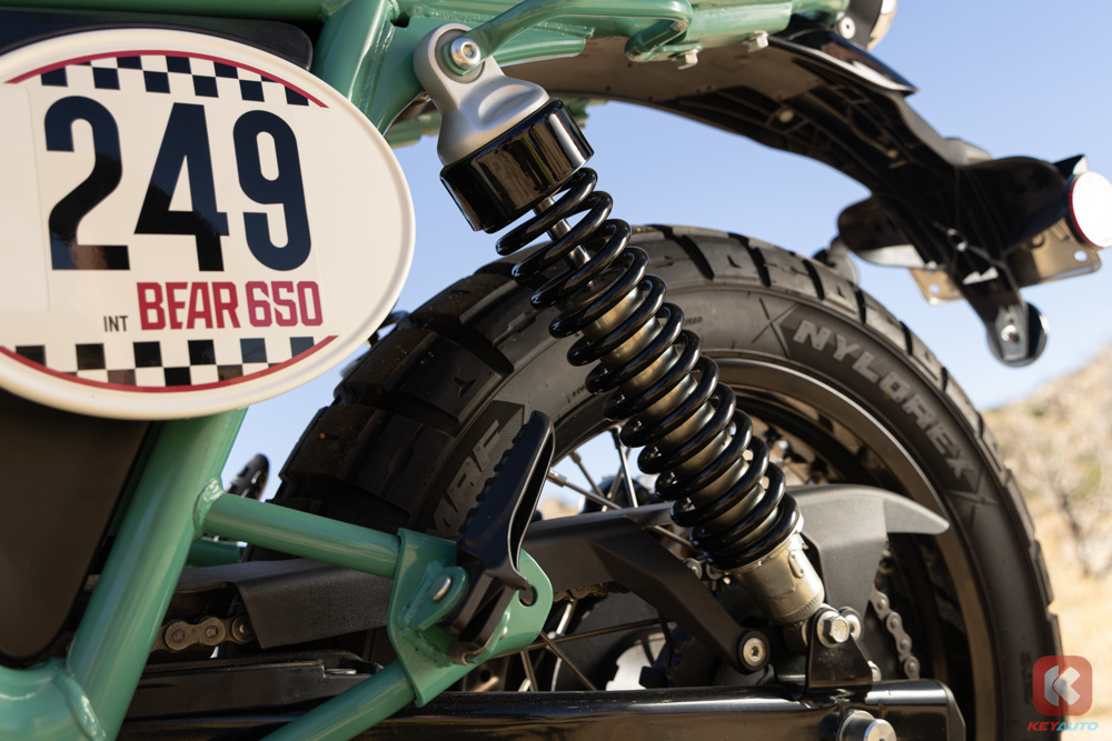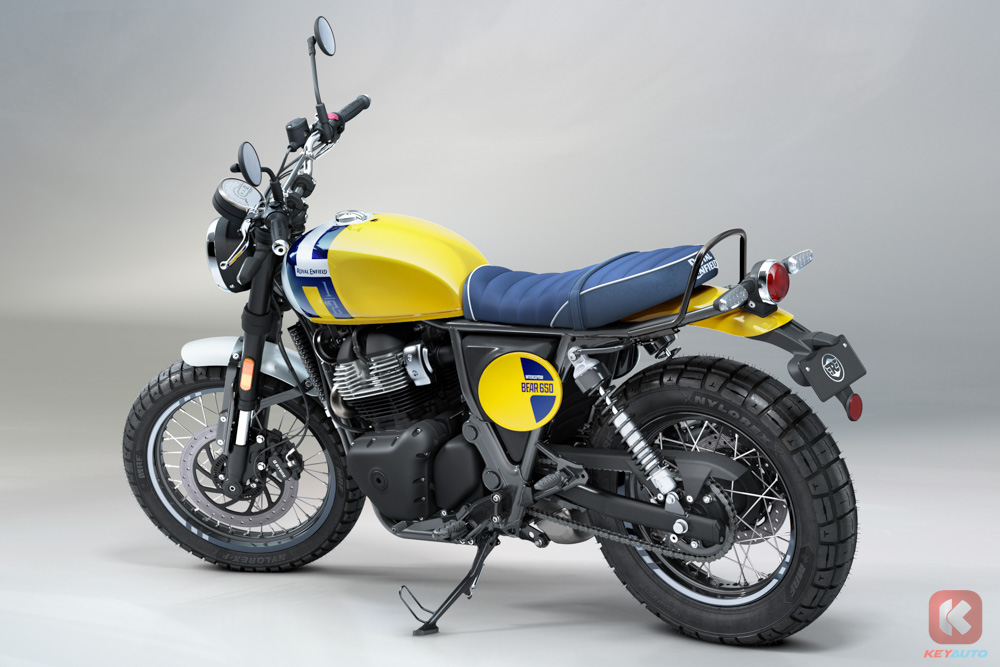 Bear 650 前叉采用 43mm 倒置 Showa 前叉,后双桶减震(预载可调),刹车系统配备 Bybre 搭配前后 ABS 系统,后 ABS 可单独关闭。轮圈采用了前 19 寸,后 17 寸钢丝辐条轮圈,搭配上 ”菠萝胎“,为的就是让骑士能够在非铺装路面可以尽情撒欢!与 Royal Enfield 自家其他 650 车系不同的点在于,Bear 650 的排气头段管路经过重新设计,采用单边单出,排气声浪更加浑厚!