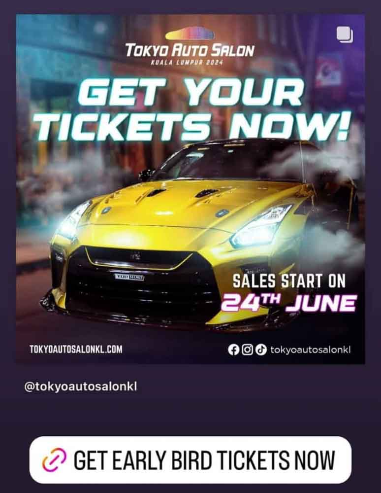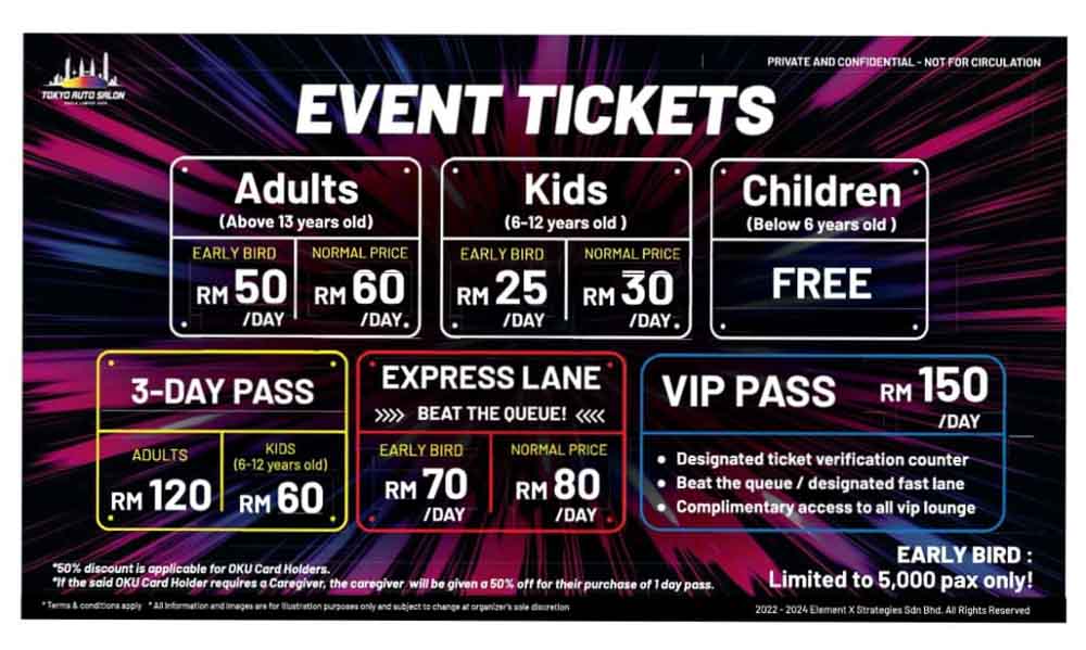 Tickets can be purchased online at https://tickets.tokyoautosalonkl.com/. Early bird discounts apply to the first 5,000 purchasers or until July 31, 2024, whichever comes first.