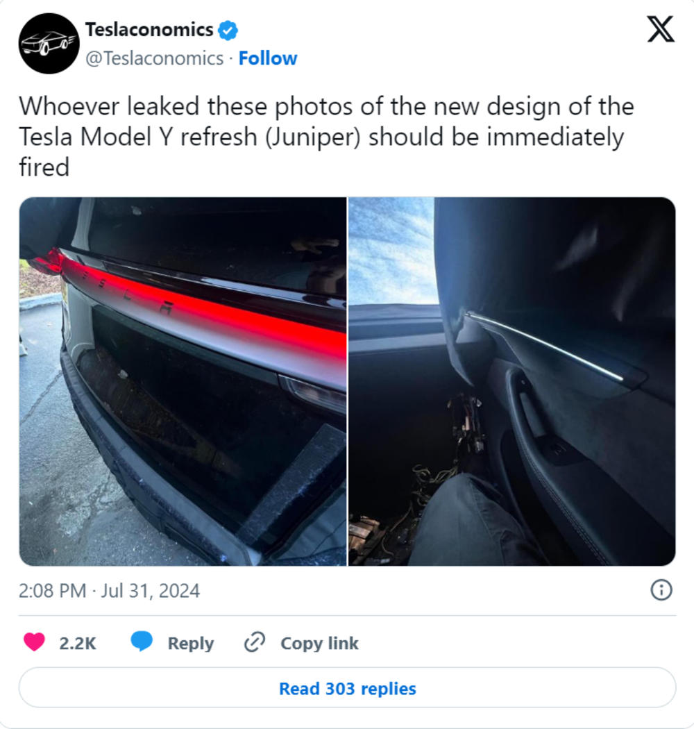 Tesla Model 3 在去年推出了改款车型,除了在外观上做出更动,也将转向灯杆改为放上攀上的按钮,而这些相信也会出现在即将面市,被命名为 Model Y “Juniper” 的新车上。