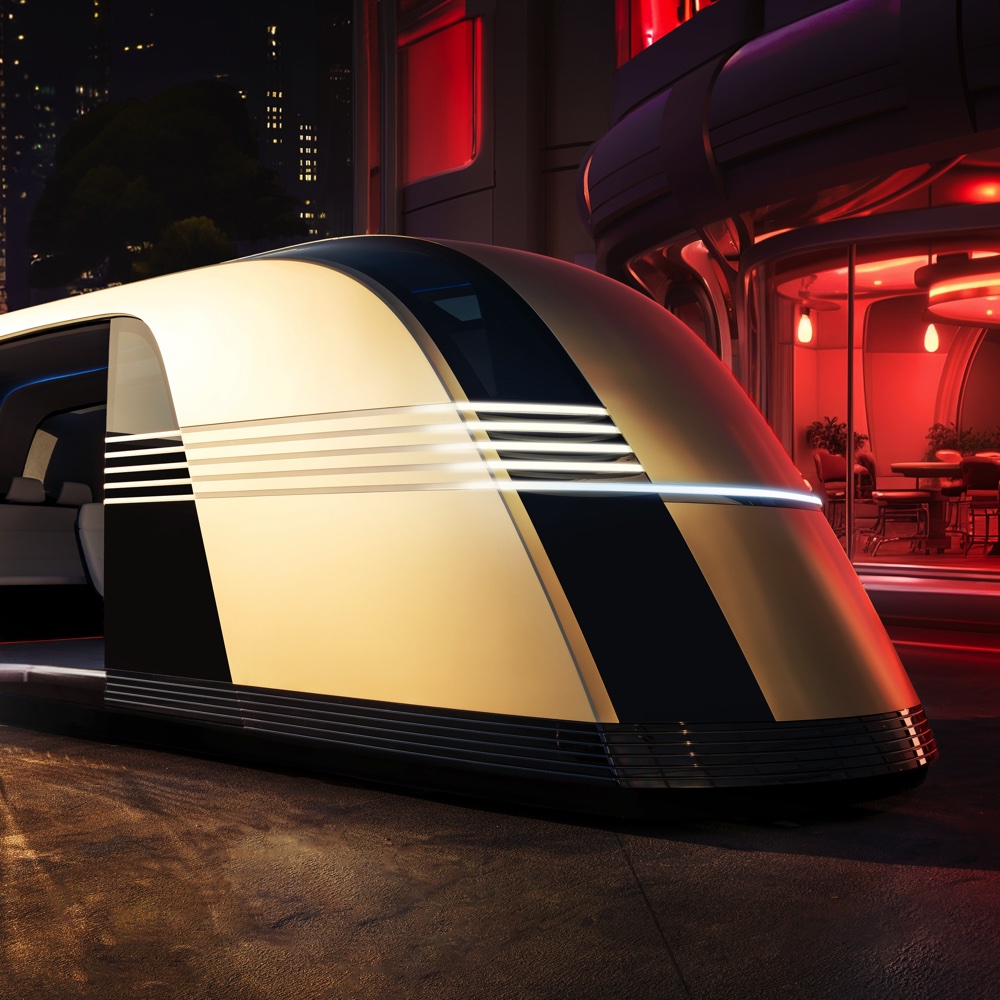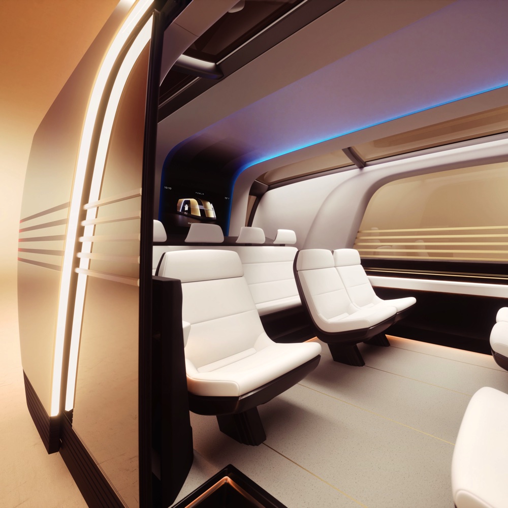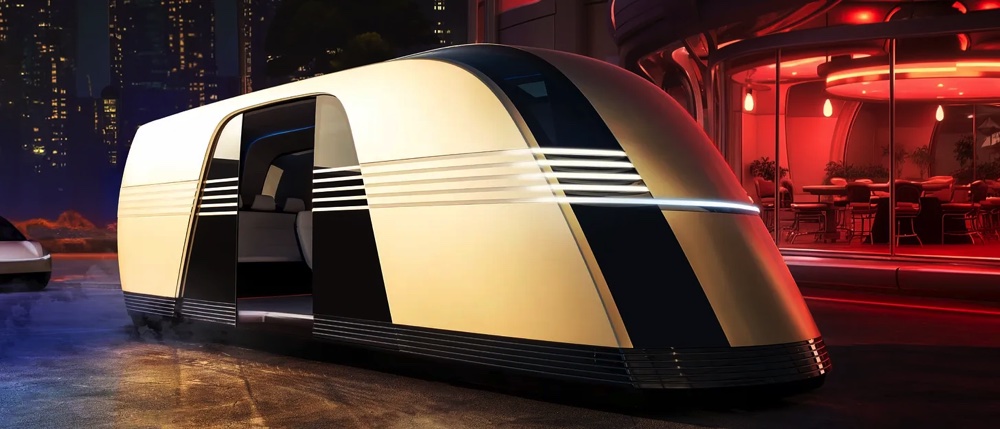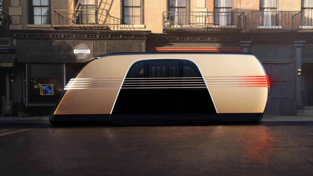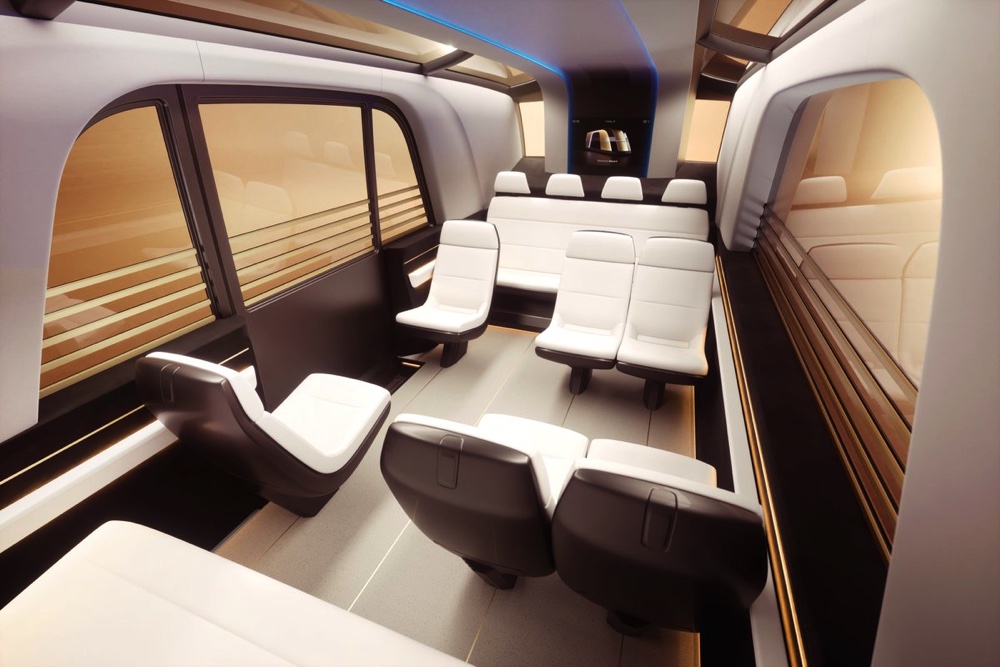 Robovan 的外观光滑,采用滑动玻璃门设计,里头采用面对面布局。轮胎隐藏在车底,乍看之下宛如悬浮在地面上。