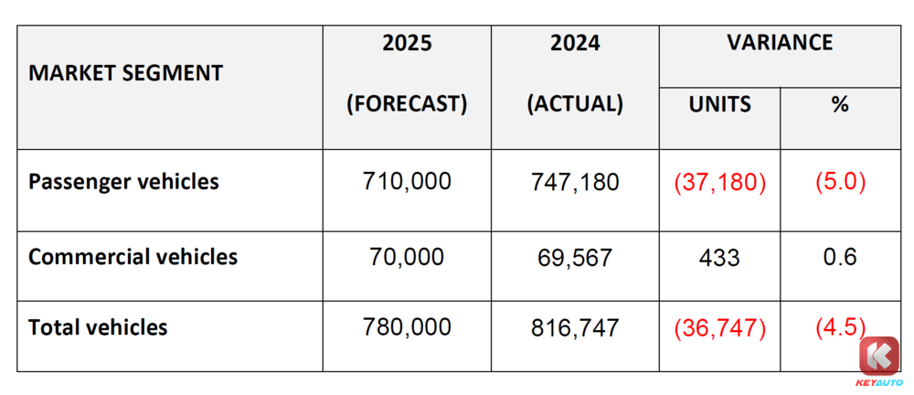 虽然 2024 年大马汽车市场表现强劲,但 MAA 综合了多时下经济和政策因素,预测 2025 年的行业总销量(TIV)将有所下降,将销量目标设在 780,000 辆。