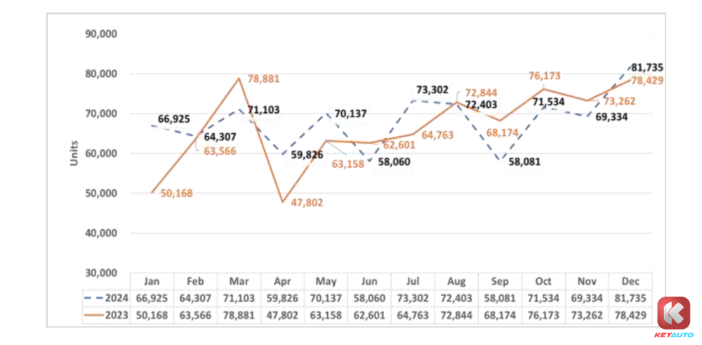 从月份上来看的话,2024 年的 1 月、2 月、4 月、5 月、7 月和 12 月的销量都比 2023 年同一时期的销量来得高,而 2024 年12 月的销量更是创下大马史上单月汽车销量新高记录,售出 81,735 辆。此前,单月销量最高记录是 2023 年 3 月份,售出 78,895 辆。