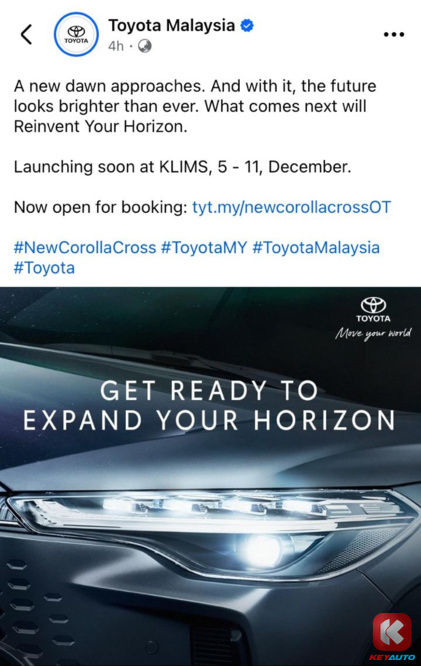 马来西亚 Toyota 在官方社交媒体上宣布,上星期开放预订的小改款 Toyota Corolla Cross 将在 12月 5 日于2024 吉隆坡国际车展(KLIMS )上发布!