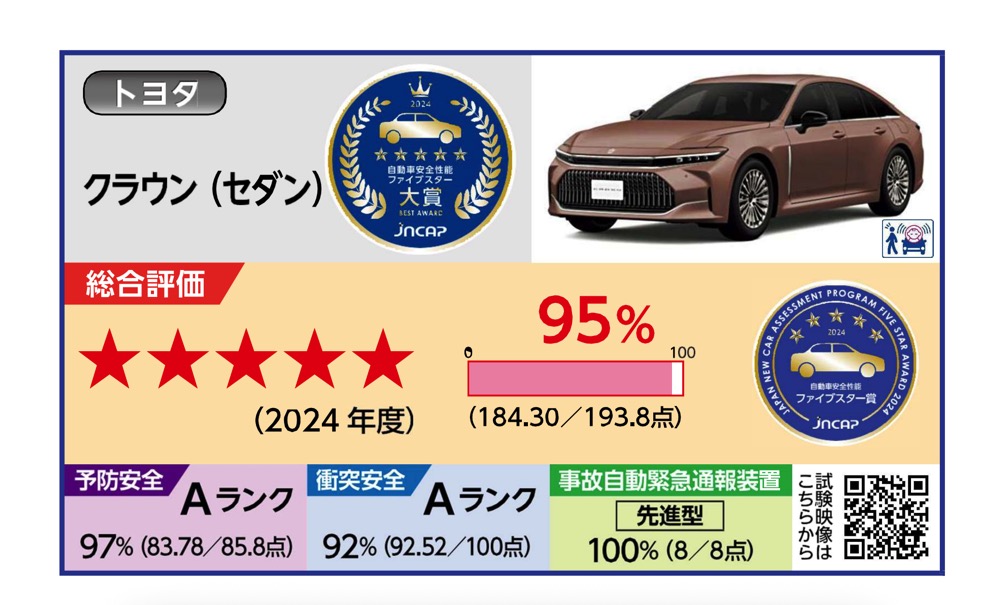 Toyota Crown Sedan 在对应于行人发生碰撞时,以减轻行人伤害的车身结构以及弹出的引擎盖,减轻了对行人头部的撞击。在各项测试中的成绩达到 95%(184.3 分),成为 2024 年 JNCAP 总和分数最高分。